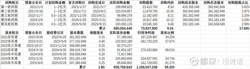 $健盛集团(SH603558)$ 公告它又做完了一轮回购,而且回购的股票全部注销,这是真回购,而不是“假回购真利益输送”(指回购股票用于股权激励或员工持股计划)。2021年以来,它已经完成了五轮真回购,累计金额达6.80亿元,回购注销的股票占第一轮回购前总股本的17.7%,这是非常明显的总股本的缩减,意味着哪怕净利润没有增长,单单依靠总股本的缩减,每股收益都能增长21.5%。除了回购外,该公司派发股息也非常慷慨,最近这四年半里,它派息了6.57亿元,同期的净利润是11.66亿元,也即净利润中的56.3%用于派息了。再考虑到回购金额也有6.80亿元,加上派息是13.37亿元,比同期的净利润还多,也就是说,该公司把它赚取的全部净利润都回馈给市场了,了不起!如果A股里公司都跟它一样,那这个市场就不愁发展不好啊!如果这公司能维持未来每年每股0.50元的派息的话,当前股价9.84元,股息率就有5.08%;如果变差一点,降到每股0.40元的话,股息率也还有4.07%。当然了,这公司业务比较乏味就是了,主要就是做袜子和内衣,就不要考虑什么成长性了。
