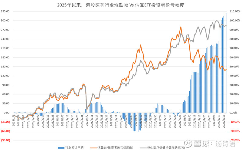 刚才说到科创板的ETF的投资者非常善于“网格交易”,令他们的收益率大大超过指数,但我也找到了反例,就是港股医药股的ETF的投资者。从图里面可以看得很清楚,从今年年初到7月25日这段时间里,港股医药股的ETF没什么申购,但恒生医疗保健指数暴涨了73.9%;而从7月25日到昨天(9月18日),投资者却疯狂冲进来近330亿元,而这期间指数只涨了12%,考虑到这330亿元是陆续进来的,成本平均起来,它们的收益率应该是远低于12%的,6%有没有都不好说,也就是说,对于高位冲进来的这330亿元,指数跌个6%,可能就被埋了。而今年以来恒生医疗保健指数涨了94.8%,回调个6%甚至都算不上什么新闻......而我统计的这26家样本ETF的总规模是958亿元,其中330亿元是高位追进来的,也即超过1/3的规模是追高买的,也真是没什么可说的了......$港股创新药ETF(SH513120)$ $港股创新药ETF(SZ159567)$