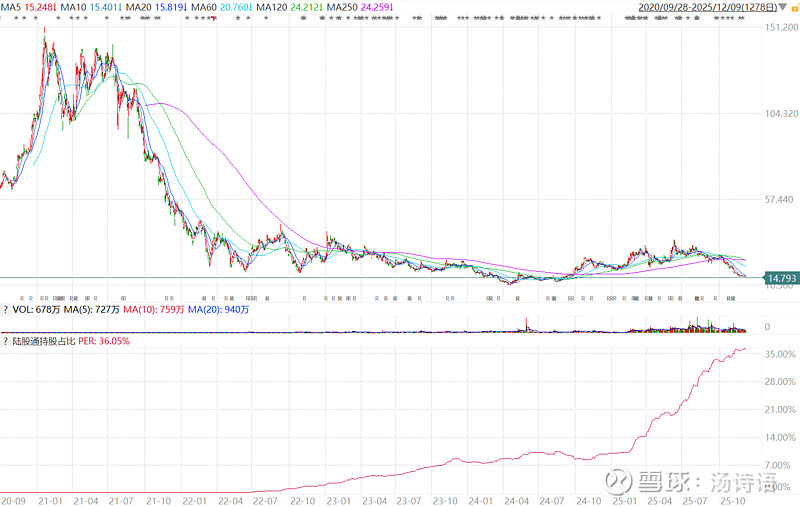 股,似乎奔着历史新低杀过来了;此图下部的“陆股通持股占比”的趋势十分感人。我印象中,今年早些时候,该股是这里的热股,讨论相当火热;这里不会真有人成了“陆股通持股占比”中的分子吧?