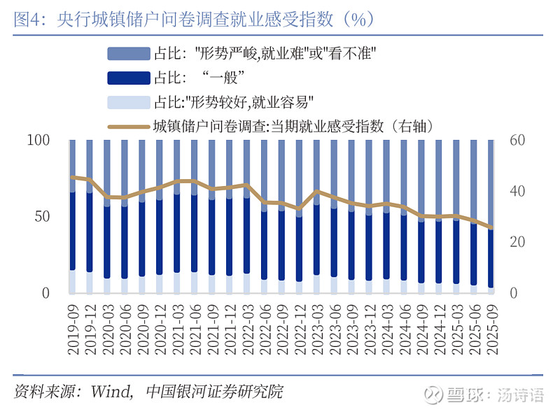 分析师们心心念念的所谓“超额储蓄”,高盛测算有55万亿元(图1),摩根士丹利测算有30万亿元(图2),如果能把这些钱赶进A股,那A股得飞上天啊!但是,这些钱真能去股市么?未必,央行一直在做的就业感受指数,这些年来感到就业难的比例越来越高了(图3),统计局做的消费者信心指数中的收入分项跳下来后、就再没上去过(图4),因此,所谓的“超额存款”,可能只是居民们自己在给自己准备失业保险罢了。之前的存款增长是储备用于教育医疗养老等,近年来又多了个失业保险的需求,所以看上去有了“超额储蓄”。确实,中年失业很可怕,而且因为延迟退休,拿退休工资的年龄往后延了,因此居民们确实需要给自己多准备失业保险,这种钱应该是不敢冒险去波动剧烈的A股的,况且A股的整体股息率好像也就1.5%而已,还不如很多城农商行的一年期大额存单(1.6%~1.7%,极少数可能略高于1.8%)。诚然,一年期大额存单1.6%~1.7%的利率也确实低,所以存款搬家也有一点点,去向是固收类的理财产品、以及保险,今年理财确实卖得相当好(图5),保险卖得也不错。
