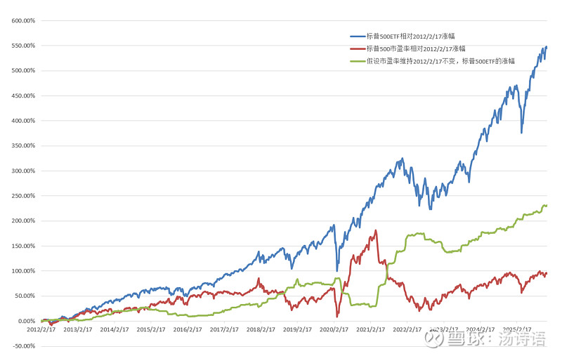 美股是涨盈利还是涨估值?都有,但主导还是盈利。这里选的是费率最低的ETF$标普500ETF-Vanguard(VOO)$ ,从它上市那天(20120217)算起,到本周末(20251212),它的涨幅高达544.68%;而市盈率从14.93倍升高到29.04倍,涨幅94.50%,估值确实扩张了;但假设市盈率始终维持14.93倍不变,那标普500ETF依然能涨231.45%;因此,很显然,美股的涨幅主要是盈利驱动,估值扩张是次要的;而且,这里假设是市盈率维持14.93倍不变,但以这么好的盈利增长能力,给20到25倍市盈率不过分吧?合情合理吧?这样看,现在29.04倍市盈率也没特别离谱。