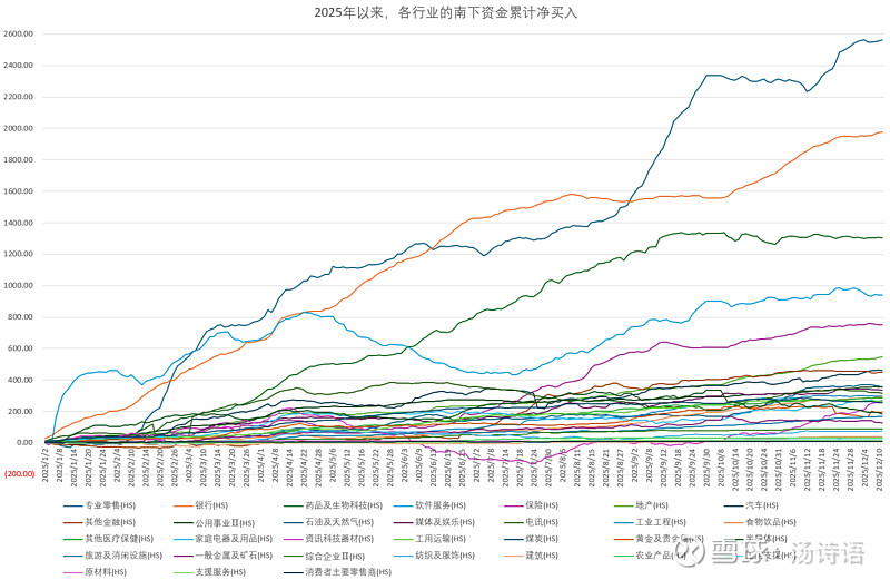 有朋友问港股通的情况怎么样。近期南下买入速度是有明显放缓的,而且,内资南下买入也等价于外资卖出,这点需要理解清楚,因此,内资南下买入放缓对港股的影响不小。南下买卖各行业的情况可以看第2张图,南下资金还是比较喜欢专业零售(主要就是阿里和美团)和银行的,但近期买入它们的速度也有放缓,导致$港股通互联网ETF(SZ159792)$ 及$香港银行LOF(SH501025)$ 近期走势不佳。