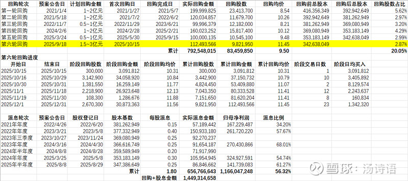 $健盛集团(SH603558)$ 公布了2025年12月份的回购数据,12月份回购了3087万元,回购股数267万股,估算均价为11.56元/股,当前股价11.27元。整个第六轮回购已回购了1.12亿元,回购均价11.45元/股。根据1.5~3亿元的总计划回购金额计算,至少还要回购0.38亿元,至多则是1.88亿元。当前市值则是39亿元,也即至少还得回购大概1%的总股本。由于该公司的回购股票都是注销的,所以总股本越来越小,就算净利润维持不变,每股收益都能增长。这公司是个超级冷门股,倒是真的实践了“每个公司的最终买家都是公司自己”这个道理啊。