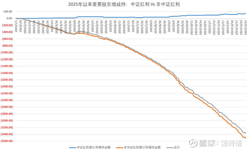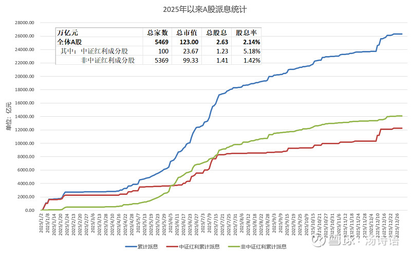2025年全年,所有A股总共派息2.63万亿元,按12月31日收盘价计算的总市值为123万亿元,因此股息率为2.14%;而这里面有接近一半的股息(1.23万亿元)是那100个$中证红利(SH000922)$ 成分股贡献的,这部分股票的总市值只有23.67万亿元,因此股息率达5.18%;另外5369个股票的总市值高达99.33万亿元,但股息只有1.41万亿元,股息率仅1.42%。不过,需要注意,派息金额是按总股本计算的,由于A股没有自由流通股本的数据,所以没法计算A股股民真实收到的股息有多少;不过,大部分公司有一半左右的股票是大股东持有,简单除以2估一下量级,应该没问题。