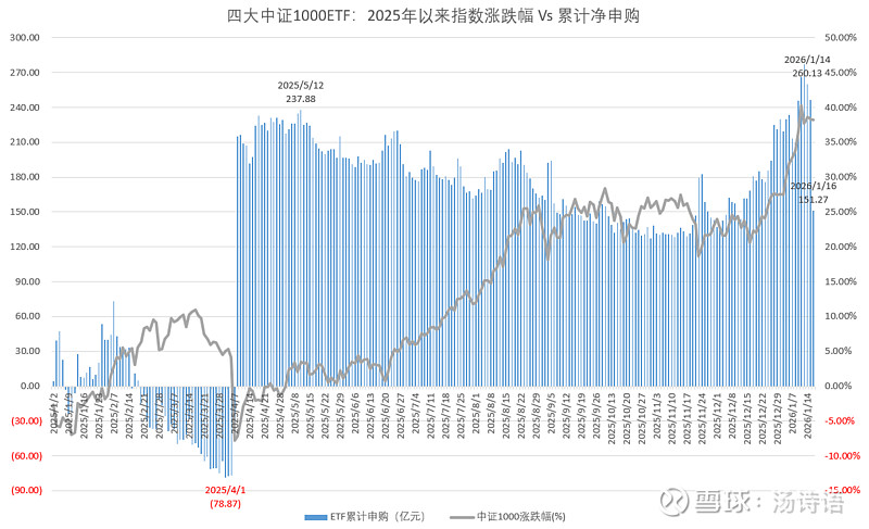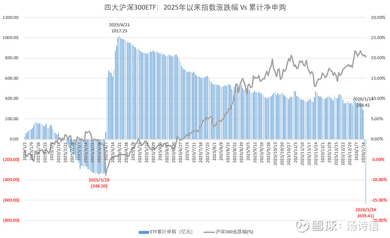 “国家队”卖出ETF?上周四周五(20260115~16),部分ETF急剧放量,盘中交易价格打出了较明显的折价,显示有资金主动卖出,且量级较大;而从这些ETF的份额数据看,这两天也出现了巨额净赎回。这里列了“中央汇金”为最大持有人的四大沪深300ETF、三大中证500ETF和四大中证1000ETF的2025年以来累计净申购的金额,可以看出,那两天里,四大沪深300ETF被净赎回约928亿元,三大中证500ETF被净赎回约157亿元,四大中证1000ETF被净赎回约109亿元。前段时间$中证银行(SZ399986)$ $中国移动(SH600941)$ 等偏红利、偏价值等板块莫名其妙地走势极弱、破位下行,现在看,大概是有人提前知道一些事情了。