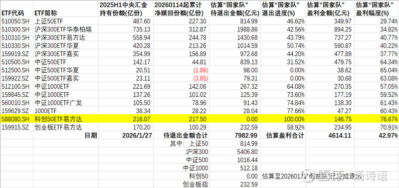昨天(20260127)“国家队”继续退出500多亿元,比前天的1100多亿元要少一半多。“国家队”的累计退出金额已达7500亿元左右,退出进程已经过半,其中属于“小登股”的科创板已全退、中证1000退出超过七成、创业板也接近六成,这三个加一块只剩不到750亿元了,按市场当前的热度,一天接完都轻轻松松;因此,未来几天,可能依然会出现小登股不听话瞎涨时、老登股就被狠踹一脚的场面,特别搞笑。