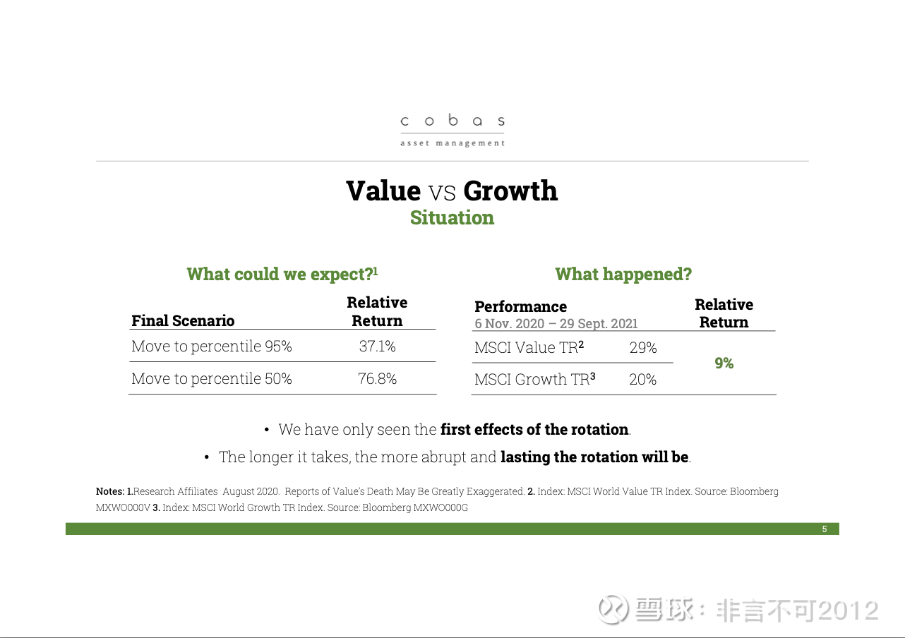 那么我们可以期待什么呢?这些数字来自 Research Affiliates 的研究工作:如果市场回到第 95 百分位,价值相对于成长的超额回报将达到 37%;如果市场回到 50 百分位(也就是均值),超额回报将达到 76.8%。有趣的是,在 2000–2002 年这三年间,价值相对于成长的表现大约是 80%。坦率地说,我认为我们现在所处的环境与 20 年前非常相似,几乎让人感到熟悉。所以我们对未来的预期是:截至今年,目前价值相对成长的超额回报只有 9%;这意味着我们还有很长的路要走,未来几年价值投资将持续表现优异。