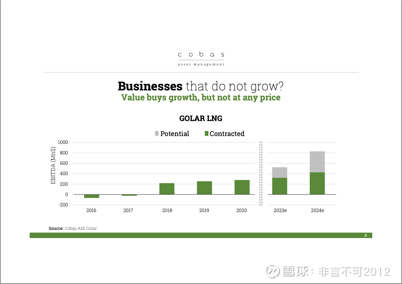 第一个是 Golar LNG。他们从事的是液化天然气(LNG)业务,这个行业目前正在快速增长。特别是他们专注于浮式液化天然气(FLNG)业务,也就是在世界各地的海上油气田直接开采天然气。这是一个当下非常有前景的方向。你可以看到这家公司过去五年的EBITDA(税息折旧及摊销前利润)变化,以及未来两三年的预期。图表中绿色部分是已经签订的合同对应的收益,而灰色部分则是假设他们可能会与新油气田签订的潜在合同。如果把这些加起来,我们说的就是大约4亿美元的EBITDA收入,已经有合同保障的部分就有这么多,同时未来潜在的机会也可能达到类似的规模,甚至更高。所以这是一个正在成长的行业,这个业务未来30年都会存在,而这家公司在其中具有独特的地位。