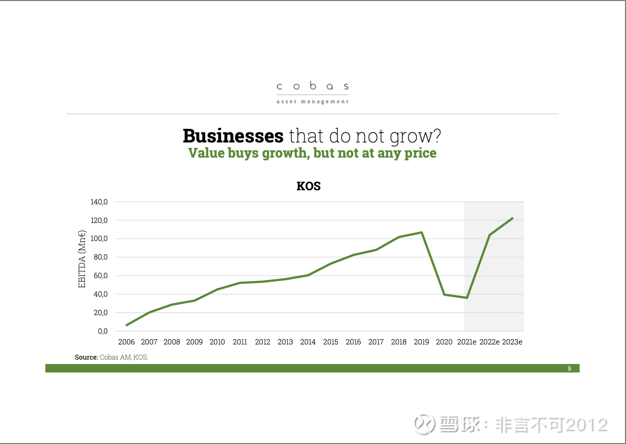 我们第二大持仓是 KOS(KOS Group),你们可能知道,它是一家意大利的医疗公司。它的主要资产是意大利和德国的养老院、康复医院,而不是急诊医院。所以,这就是过去 15 年里 KOS 的增长情况,不错。我还记得我们在 15 年前就投资了他们,当时这在他们整体业务中几乎可以忽略不计,而现在,这个业务在过去 15 年里已经有了巨大的成长。你可以看到,在去年和今年他们确实有一些波动,显然是因为疫情的影响。但随后他们会恢复,并且继续增长。因为这是一个正在成长的行业,我们都知道养老院业务正在全球扩张,尤其是在欧洲,他们的市场地位非常好。另外要记住,这家公司几乎等于让我们免费获得 KOS,因为他们本身有大量现金储备,还有其他业务。所以,简单来说,这就是价值投资:以巨大折扣买入成长型业务。大家都认可这是个会持续增长的行业,未来 10 年的发展几乎毫无疑问,而我们能够以非常合理的价格参与其中的成长。