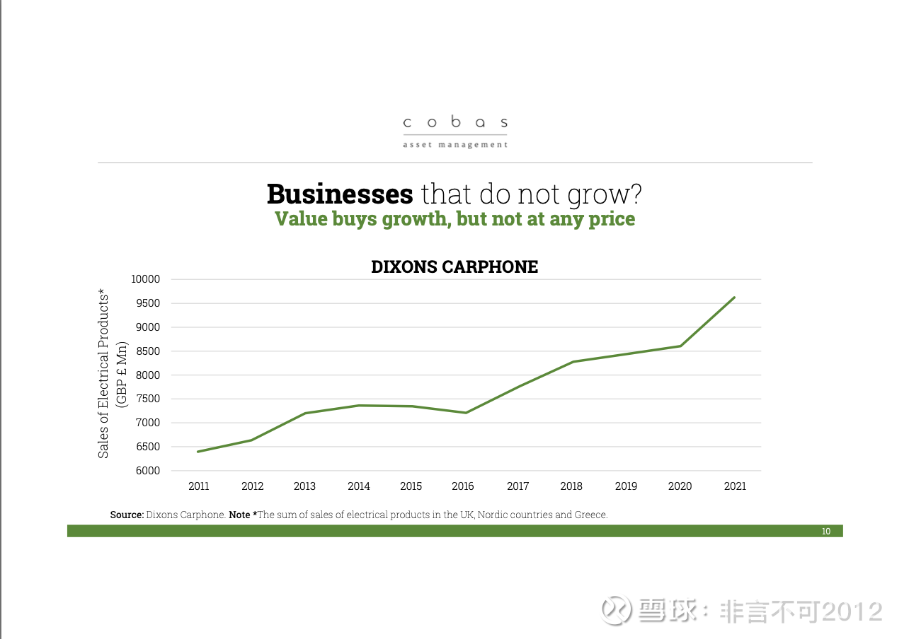 第三大持仓是 Dixons Carphone(现在叫 Currys)。这是 Dixons 的核心业务。的确,他们曾经的电信业务(Carphone Warehouse 相关)因为多种原因受到了打击,这里我们就不展开。但他们的 核心业务是电器零售与分销。而这个业务在过去 10 年里的增长也相当显著。我会说,很明显,在未来 10 年里,这个业务也完全有可能持续增长。因为你知道,家电和电子产品已经成为我们生活中非常重要的一部分,这个需求一定会一直存在。