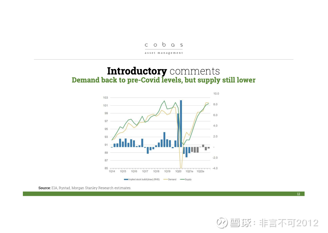 那么我们再来看看目前整个行业的情况。正如你所看到的,全球石油需求已经回升到接近疫情前的水平,大约接近每天 1 亿桶。而供应虽然存在,但目前全球的闲置产能(spare capacity)仍然很大。也就是说,我们处在这样一种局面:需求的复苏超出预期,而全球各地的情况表明,去年人们所担心的“需求被永久摧毁”并没有发生,看起来至少在未来 10 到 15 年都不会发生。
