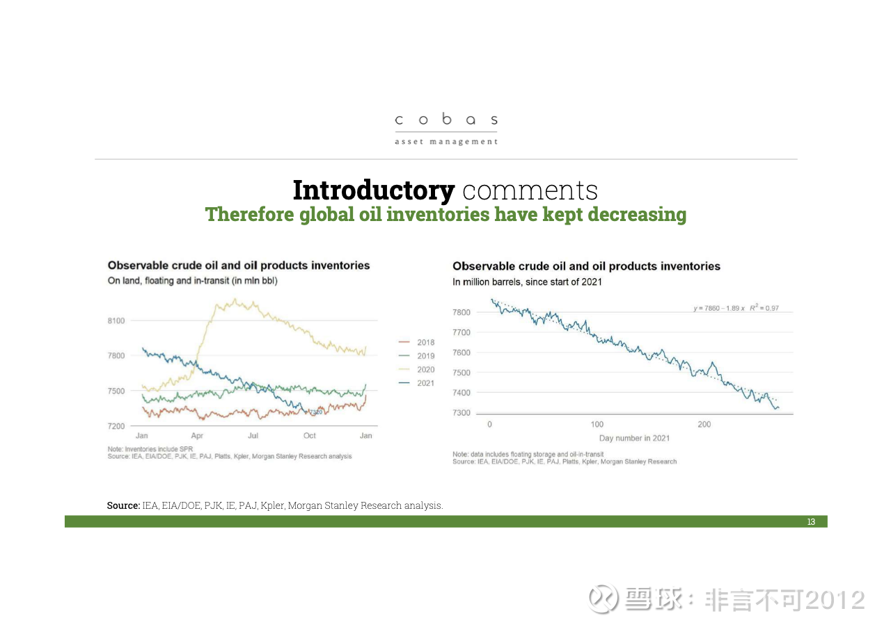 另外我们还能看到,今年以来库存显著下降。当库存下降时,这意味着供给不足以覆盖需求。确实,OPEC 仍在限制供应,但幅度已经不算大了,目前剩余闲置产能大约是 400-500 万桶/日,不会更多了。这就是当前的局面。