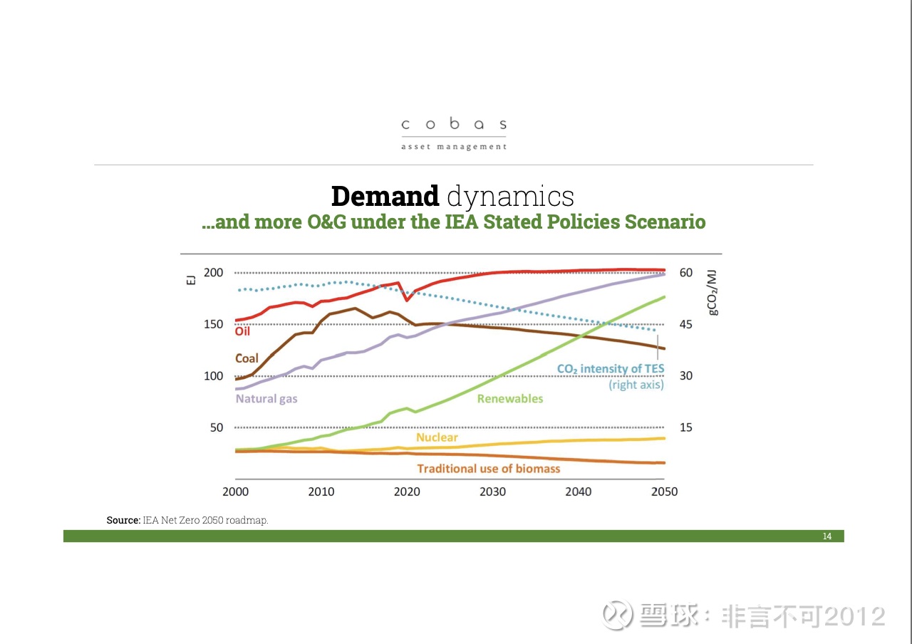 接下来,我们再看看石油行业的长期走势。我认为大家在这一点上有相当一致的共识:可再生能源的比例会不断上升,但在很长一段时间内,我们仍然需要石油和天然气。而且,天然气的需求还会继续大幅增长,它将逐步取代煤炭,这是毫无疑问的。但是石油也依然会存在,尤其是在石化产业等必需领域。所以,总体上对未来能源发展的趋势,各大机构的预测基本一致。