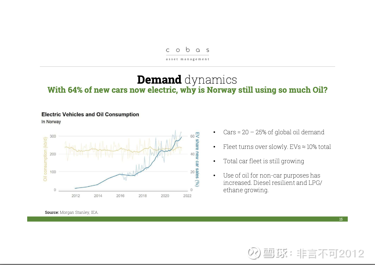 所以,虽然新闻头条都在讲电动车,但现实是石油仍然有着长期的刚性需求。好的,这当然没问题,但电动车的替代作用目前只占消费的不到 10%,而且下降会非常非常缓慢。因为大部分汽车保有量仍然是内燃机驱动的。所以我们认为石油需求在未来一段时间里依然存在,甚至还会继续增长,大概在未来 10 到 15 年内都是如此。就像我昨天读到的一篇关于印度的文章所说:印度有 13 亿人口,但他们每年只卖 400 万辆汽车,未来会增长到每年 1000 万到 1500 万辆,甚至像中国一样达到 2000 万到 2500 万辆。而且,说实话,他们买不起电动车。所以在未来 10 年里,绝大多数新车仍然会是内燃机汽车。此外,印度在石化产业上也有庞大的发展计划,需要大量石油和天然气来支持经济建设。同样,本周我在加纳待了三天,看到的情况也一样:他们迫切需要更多的石化产品,需要天然气,需要各种能源。所以我们常说,不能只用一种以挪威为中心的视角来看问题,而必须有一个全球视角。这才更符合实际。