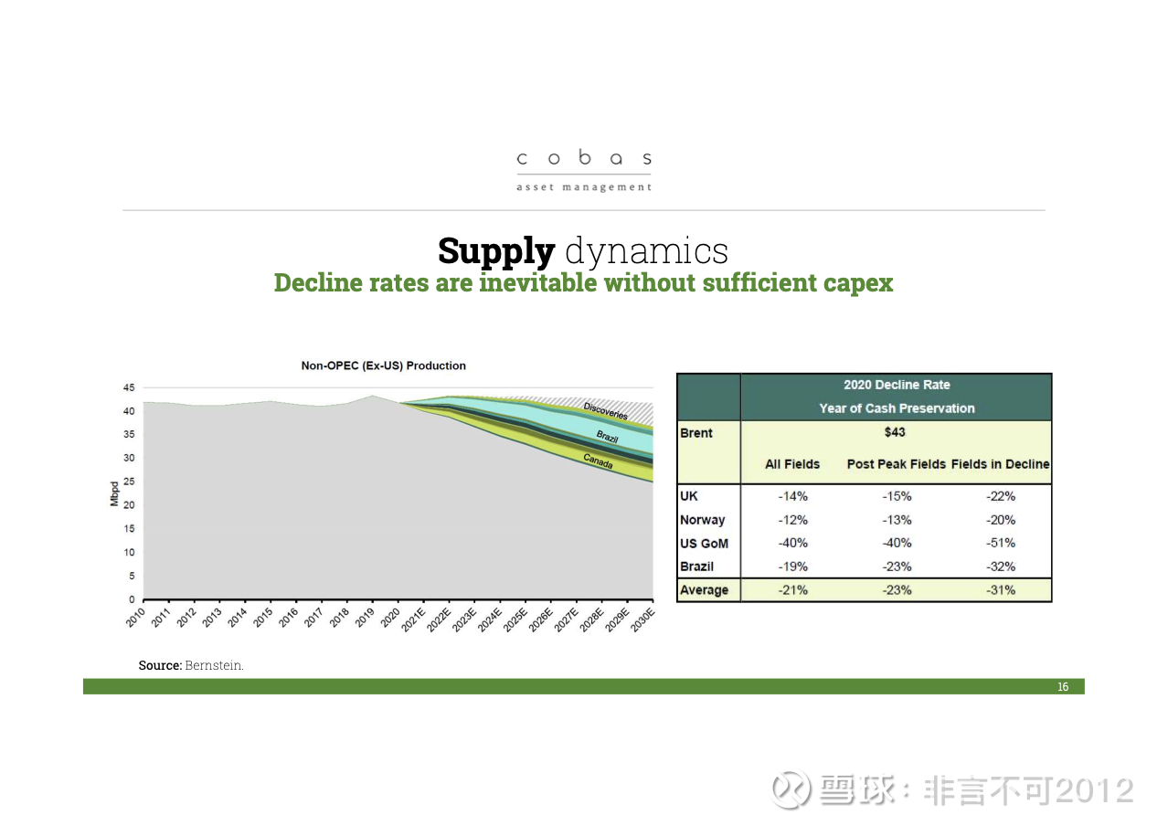 那么接下来我们看供应端。大家都知道,油田的产量递减非常显著。你可以在右边的图表上看到:有趣的是,为了弥补供应缺口,投资并不多。