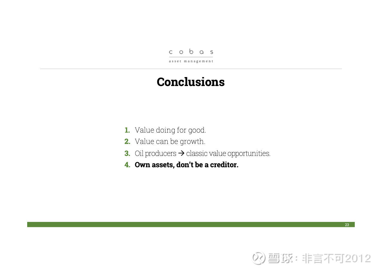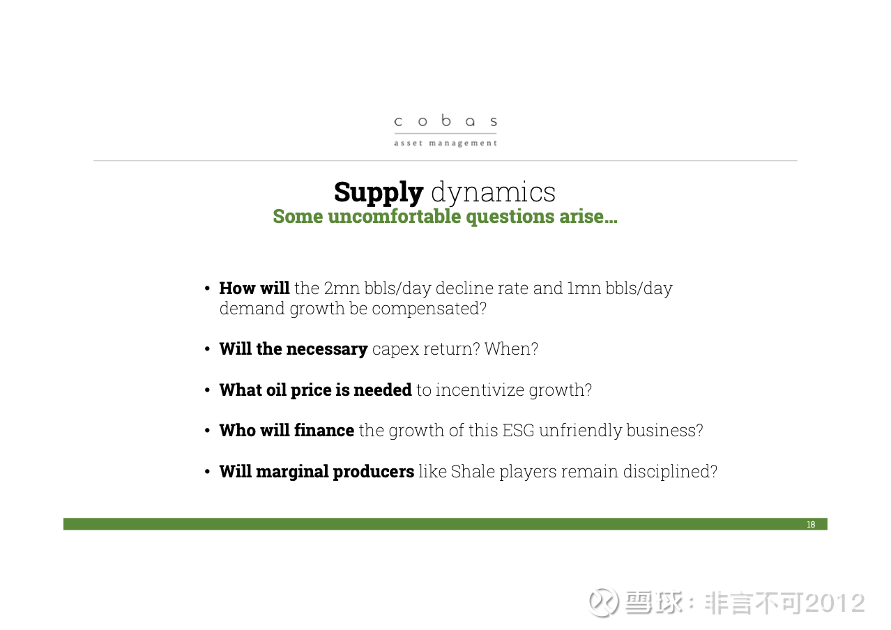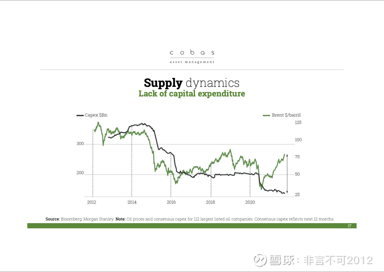 最后,我今天还想谈一个价值投资的机会:石油。目前,石油在我们投资组合中的占比大约是 15%,而且我们今年以来一直在逐步加仓。至于为什么?简单来说:这当然是一个大宗商品行业。但这完全没有问题。为什么不能投资大宗商品呢?如果能找到真正的价值机会,那当然值得投资。这正是一个典型的情形:当前行业中存在巨大的供需失衡。几乎可以说,资本并没有流入这个行业,或者说,投入的资本量相对于所需来说是非常有限的。而我们作为投资者,应该在别人不愿意投钱的地方投下资本,因为这才是能够获得高回报的地方。