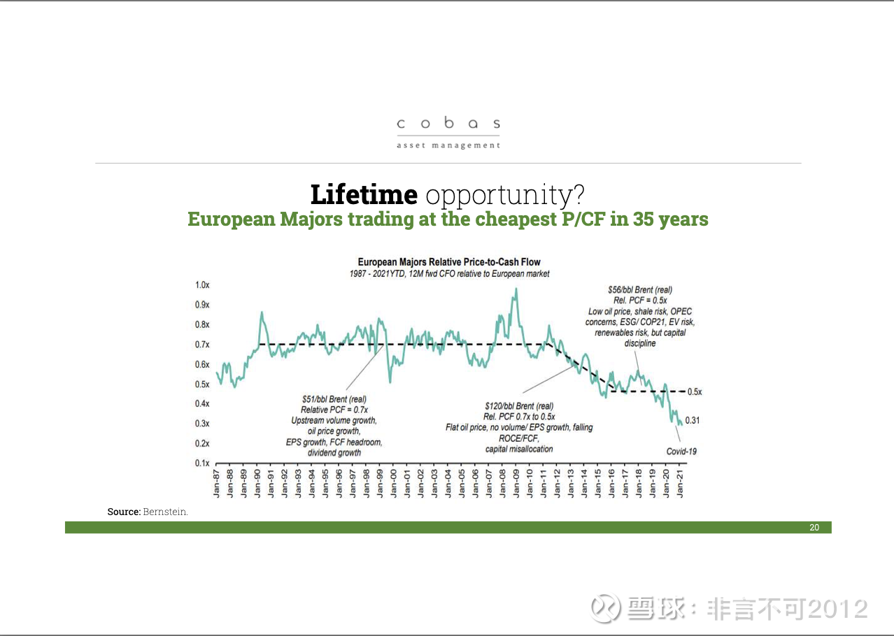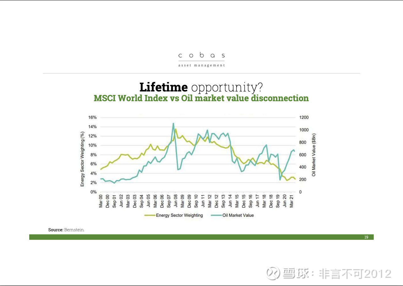 那么,我们认为有没有机会呢?这是一个非常明确的机会。上一次我们在石油行业进行大规模投资,是 20 年前,当时油价在每桶 20–25 美元,甚至有阶段跌到 21 美元左右。而现在油价处于合理水平,我们看到公司现金流价格比非常好,但市场并没有充分认可这一点。因此,我们选择投资这个板块,但我们没有投资大公司。因为我们基于欧洲,通常第一考虑的是大型一体化企业,但我们更倾向于投资中型家族企业,或者拥有合理资本结构和运营方式的企业,这让我们比那些大而官僚、受制度化约束的公司更加安心。