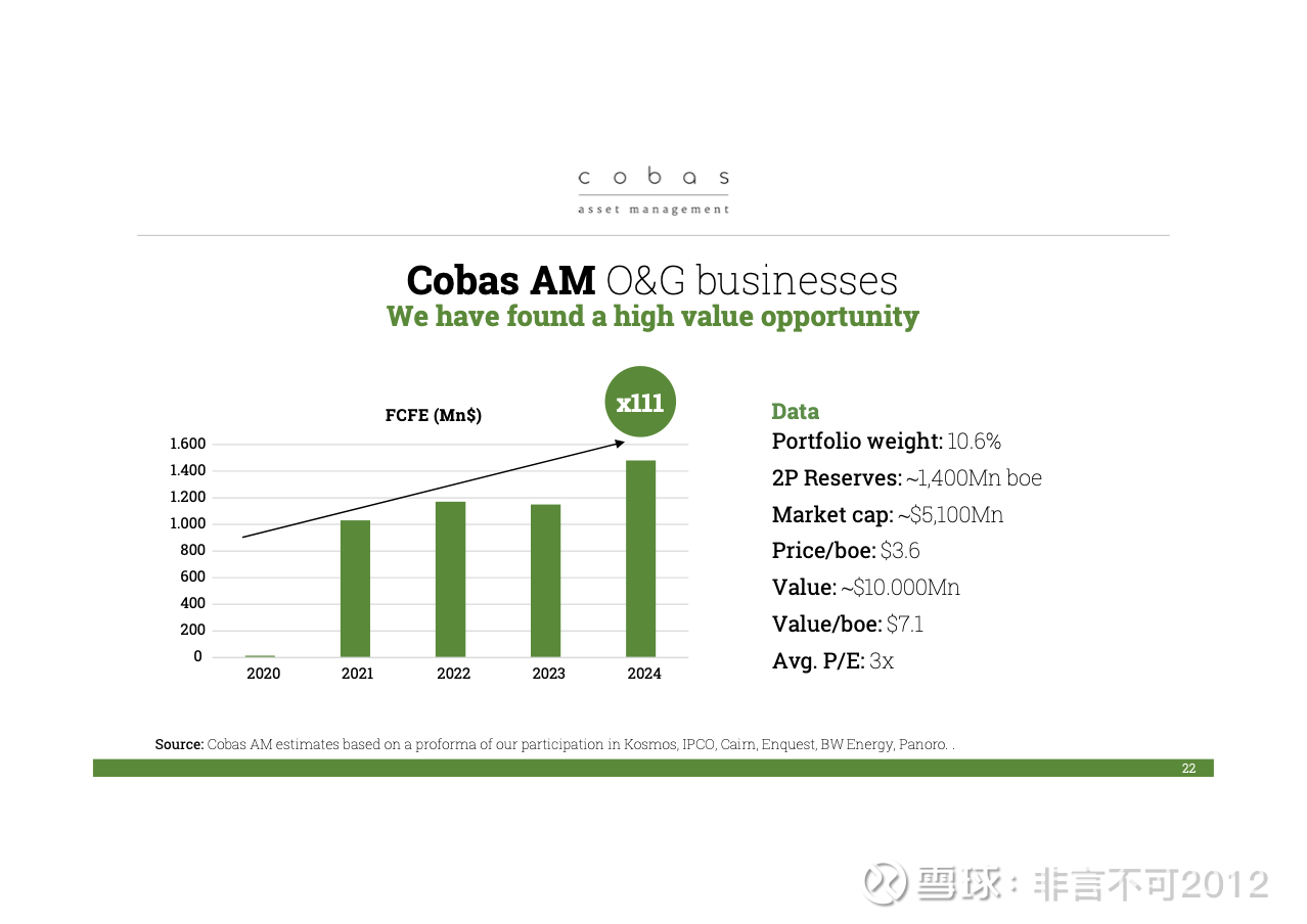 在这个价格下,我们支付的市盈率大约为 3 倍,自由现金流倍数也只有 3 倍,并且公司中的流通量有限。因此,我们认为这是一个非常有趣的投资机会。我们认为,向价值股的转变是一个持续、稳定且耐久的趋势,这是一个长期的过程。同时,我们可以在价值价格下找到成长型公司,这是完全可行的。具体来说,虽然油气行业可能不是一个非常大的成长板块,但油气勘探与生产领域,我们认为是一个典型的价值投资机会,尤其是在过去 3–4 年资本投入极少的情况下。因此,未来几年市场将会非常紧张。