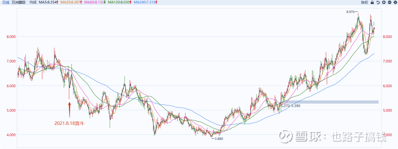 好了,万洲国际的基本面就先讲到这吧,给大家放一张万洲国际的走势图,自2021.8.18宫斗进入下行期,万洲国际的股价已经从2023.8.21最低的3.88涨到现在8.35。哪怕到如今的价格,万洲国际的滚动市盈率才不过8.23,比大A一大堆的消费企业划算得多,还很稳定。