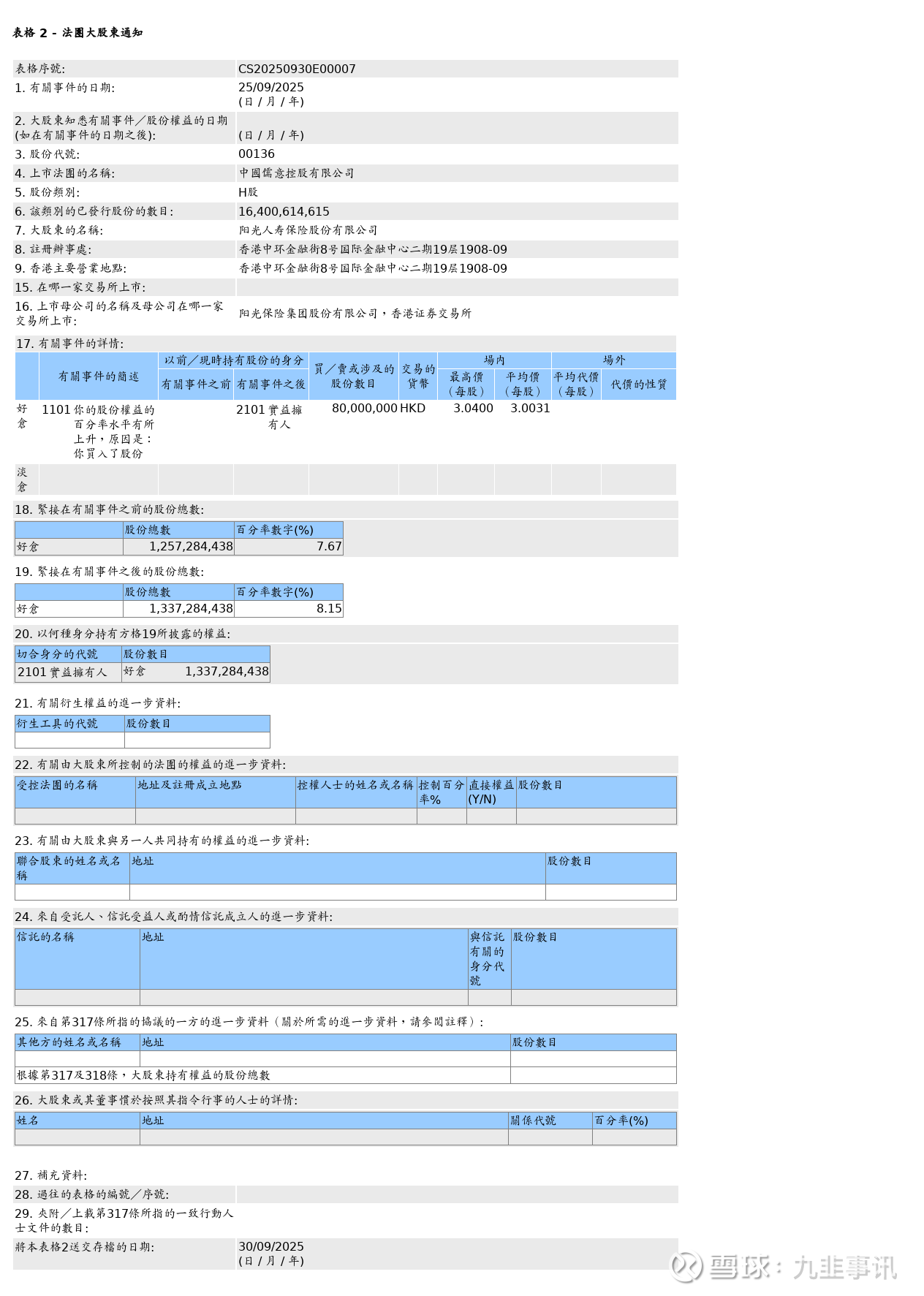 9月30日报道,根据香港联交所9月30日披露的文件,阳光人寿保险股份有限公司于9月25日以每股均价3.0031港元增持$中国儒意(00136)$ 8,000万股H股股份,价值约2.4亿港元。增持后,阳光人寿保险股份有限公司最新持股数目为13.37亿股股份,好仓比例由7.67%升至8.15%。