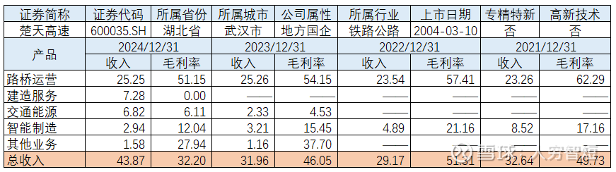 楚天高速湖北省内唯一一家高速公路上市公司,主营业务包括路桥运营、智能科技及交通能源。路桥运营拥有汉宜高速汉荆段、汉宜高速江宜段、大随高速、黄咸高速咸宁段、黄咸高速黄石段、大广北高速、新县高速、光山高速以及嘉鱼长江公路大桥特许经营权,收费里程合计约620公里,其中嘉鱼长江公路大桥25%股权拟以1.97亿元进行转让。智能科技业务主要为高速ETC改造、视频监控系统及配套等。交通能源主要为提供高速公路加油、加氢、加气、充换电等能源补给服务,经营管理13座加油站、2座加氢站、2座LNG加气站、13处充电场站。。