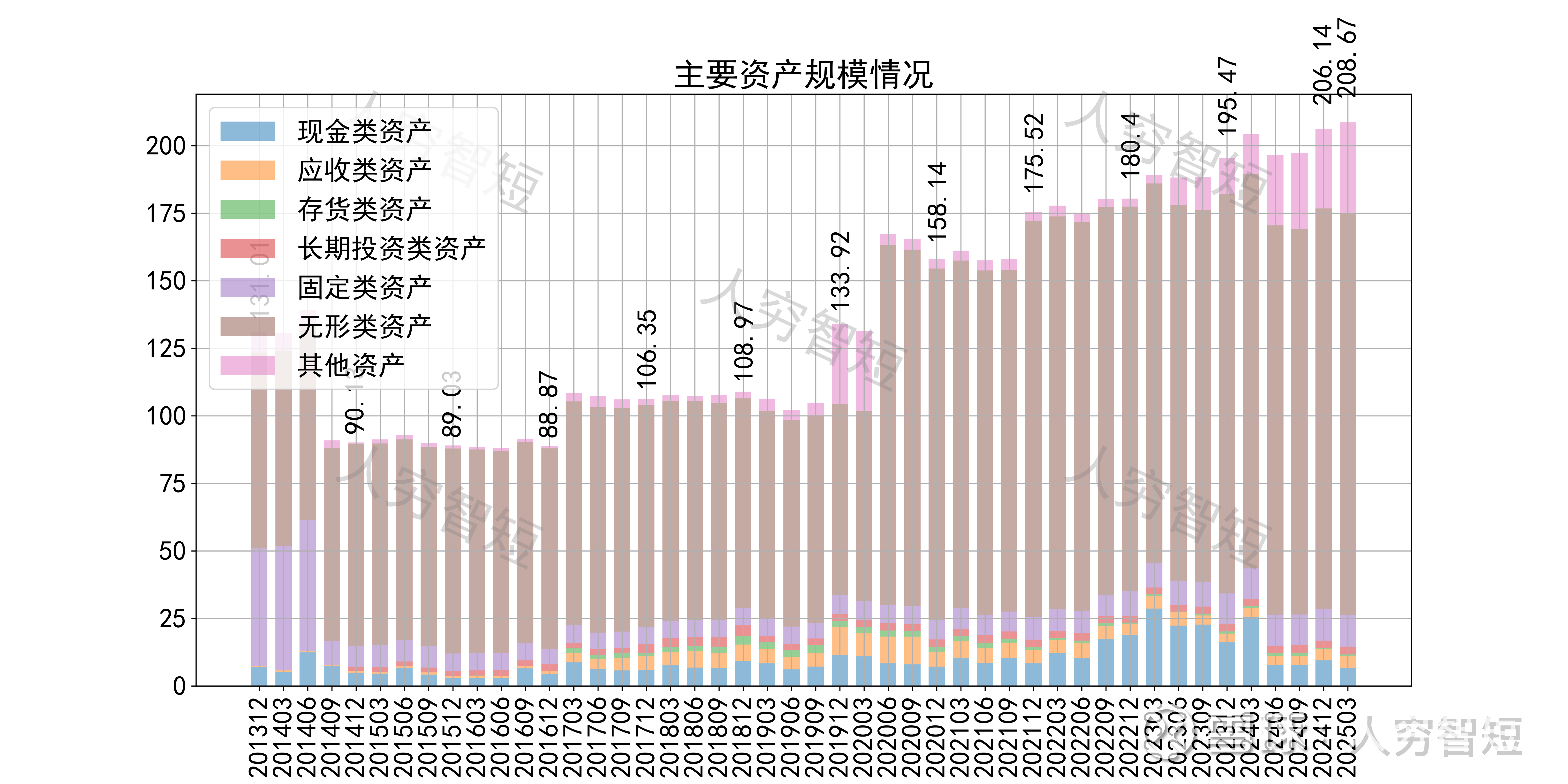 公司最近十年总资产复合增长率5.56%,截至24年末,为206.14亿元。资产结构以无形资产为主,结构较为简单。无形资产148.10亿元,其中土地使用权3.15亿元,剩余摊销年限约15年;各路段经营权133亿元,剩余摊销年限约18年。商誉8.96亿元,主要为并购深圳市三木智能技术有限公司形成,未看到大规模减值。