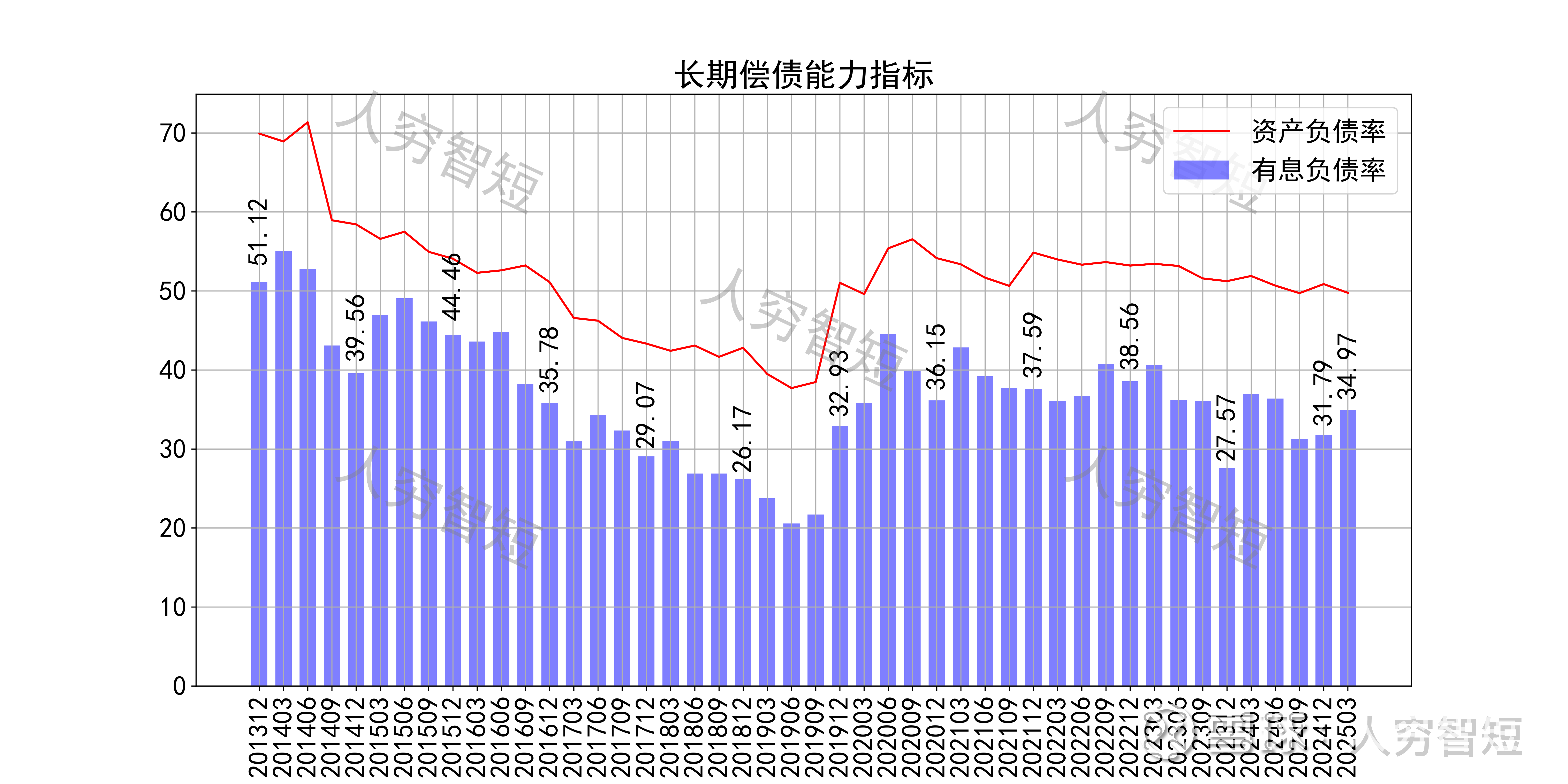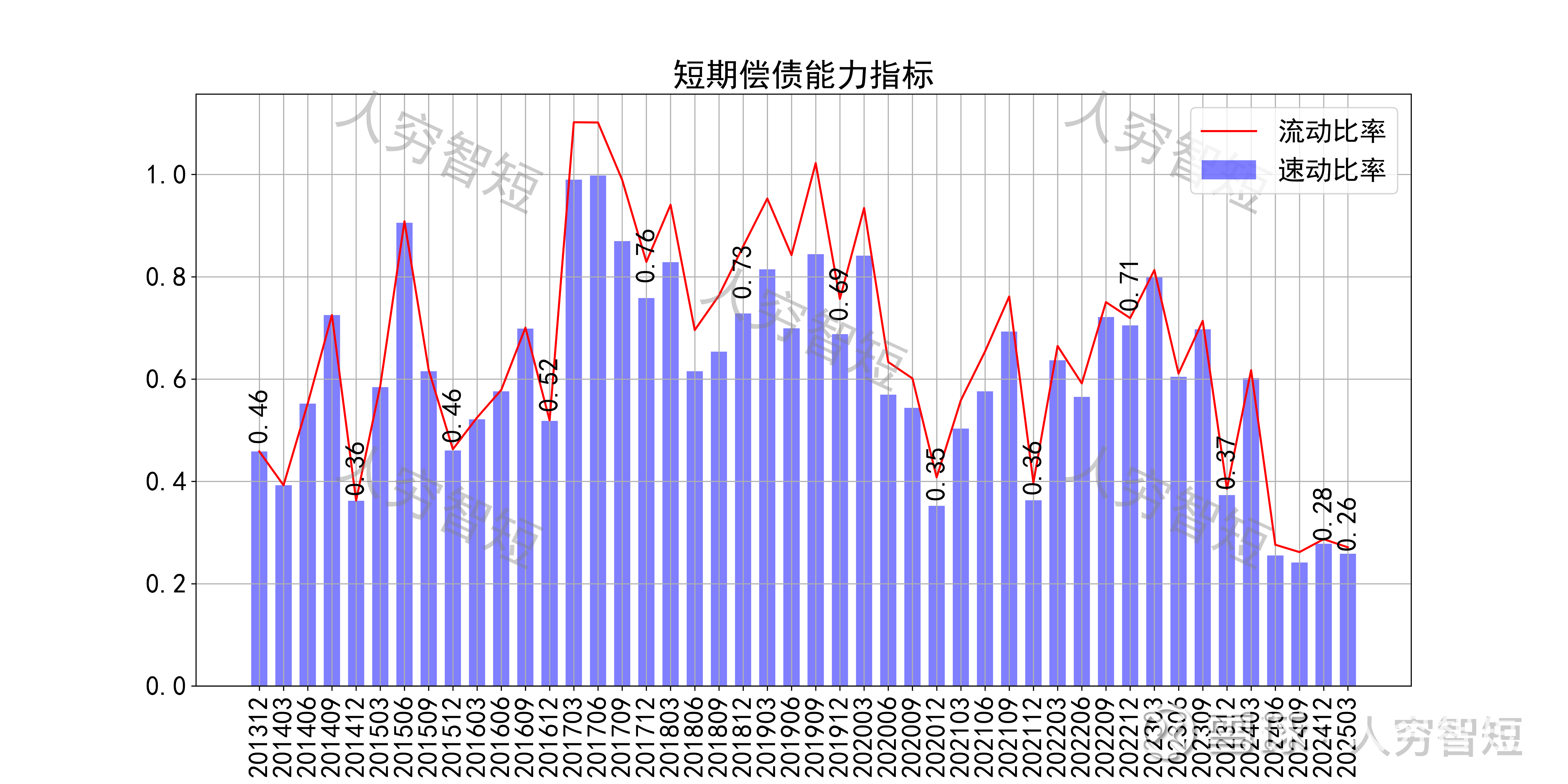 长期偿债指标中,资产负债率维持区间震荡,近年减少至50%左右,有息负债率约为34.97%,有一定的债务负担,且对供应链上、下游资金占用一般。短期偿债指标中,流动比率、速动比率较弱且持续走低,与货币资金持续消耗、短期借款、短期债券规模持续扩张有关,资产短期流动性极弱。