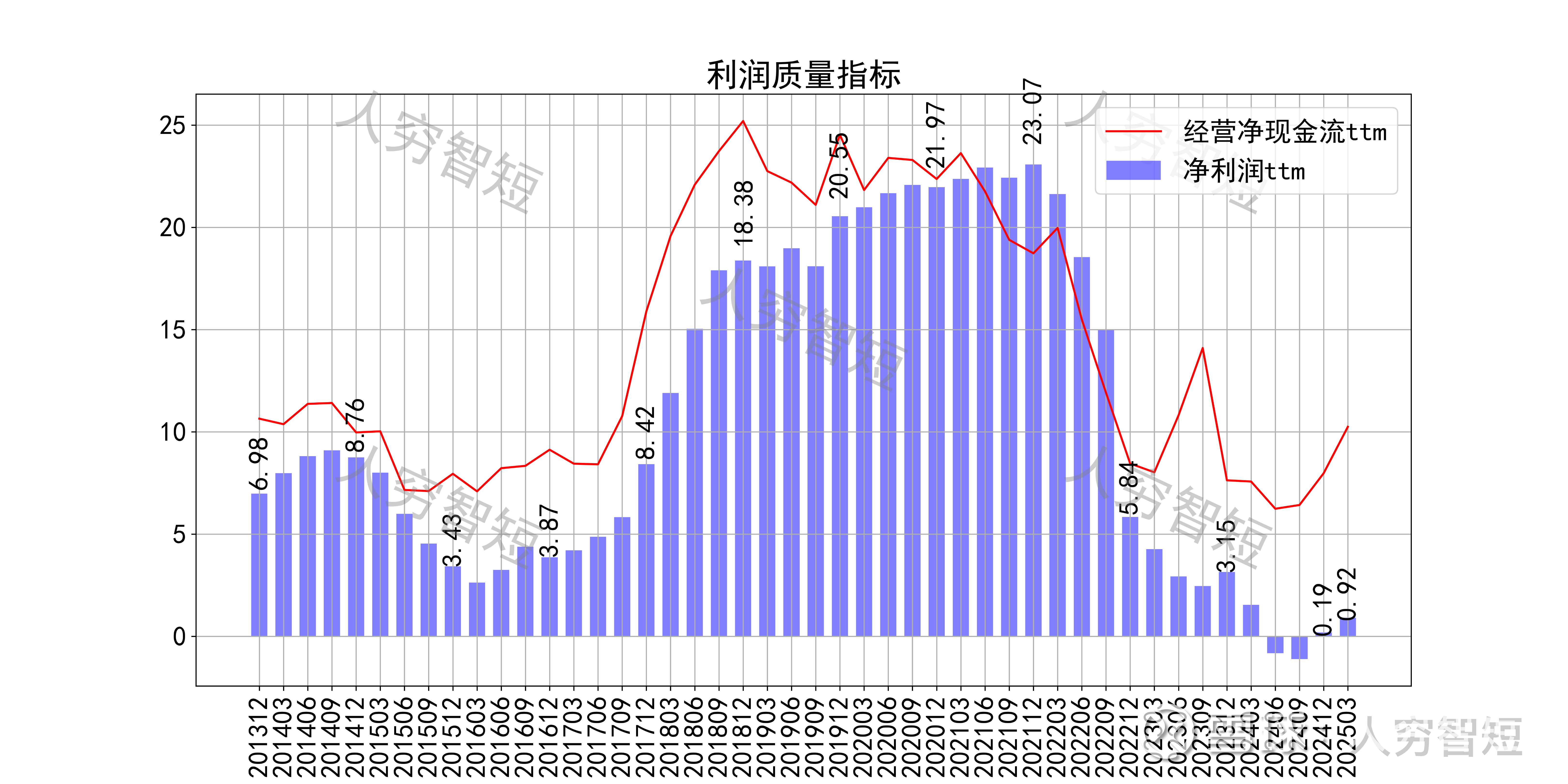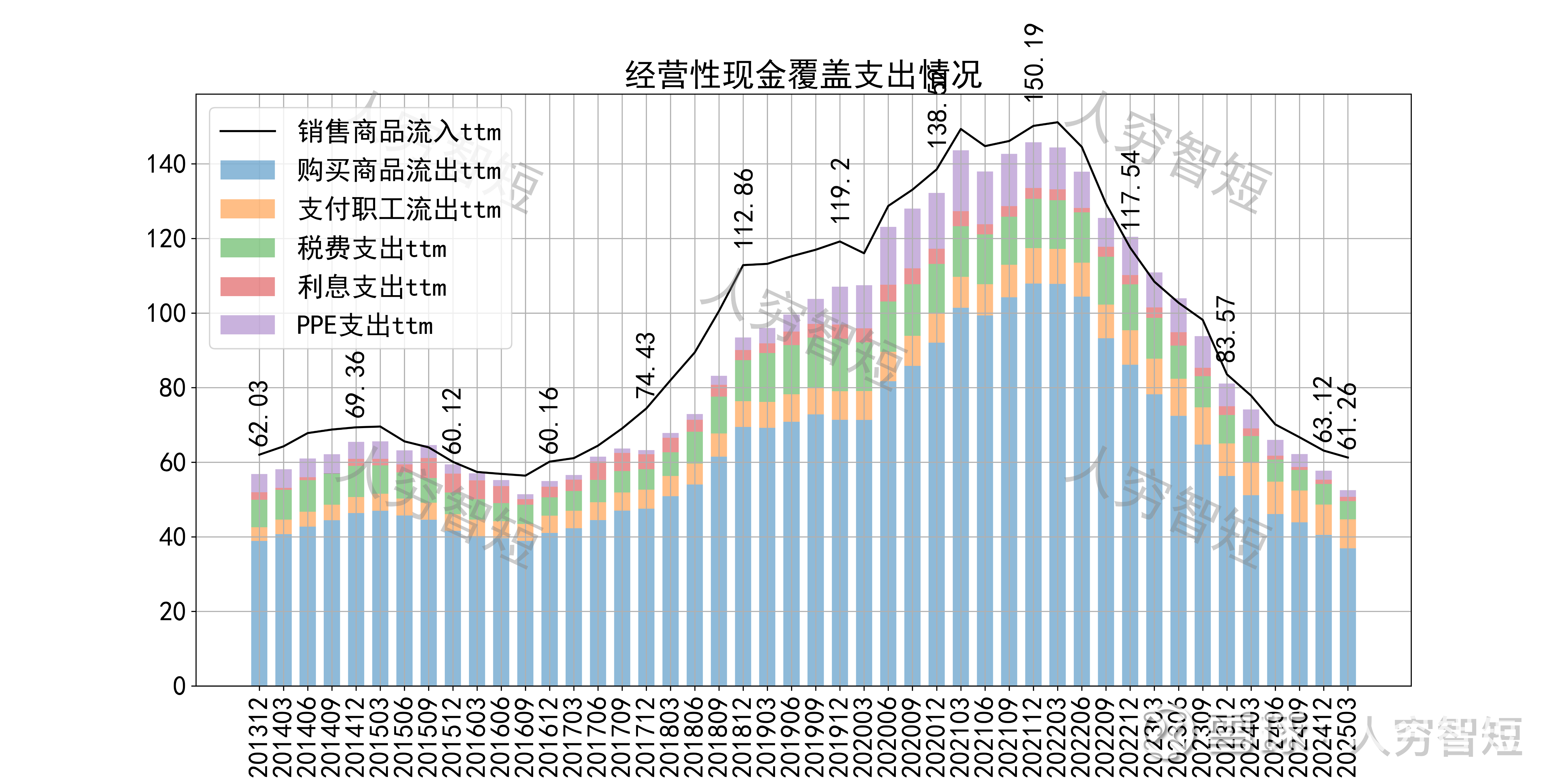 收入、利润的现金含量来看,近年来销售商品流入的现金流完全覆盖营业收入;经营现金流波动较大,平均净额高于净利润,主要差异源于各项资产折旧摊销(年约5亿元)。