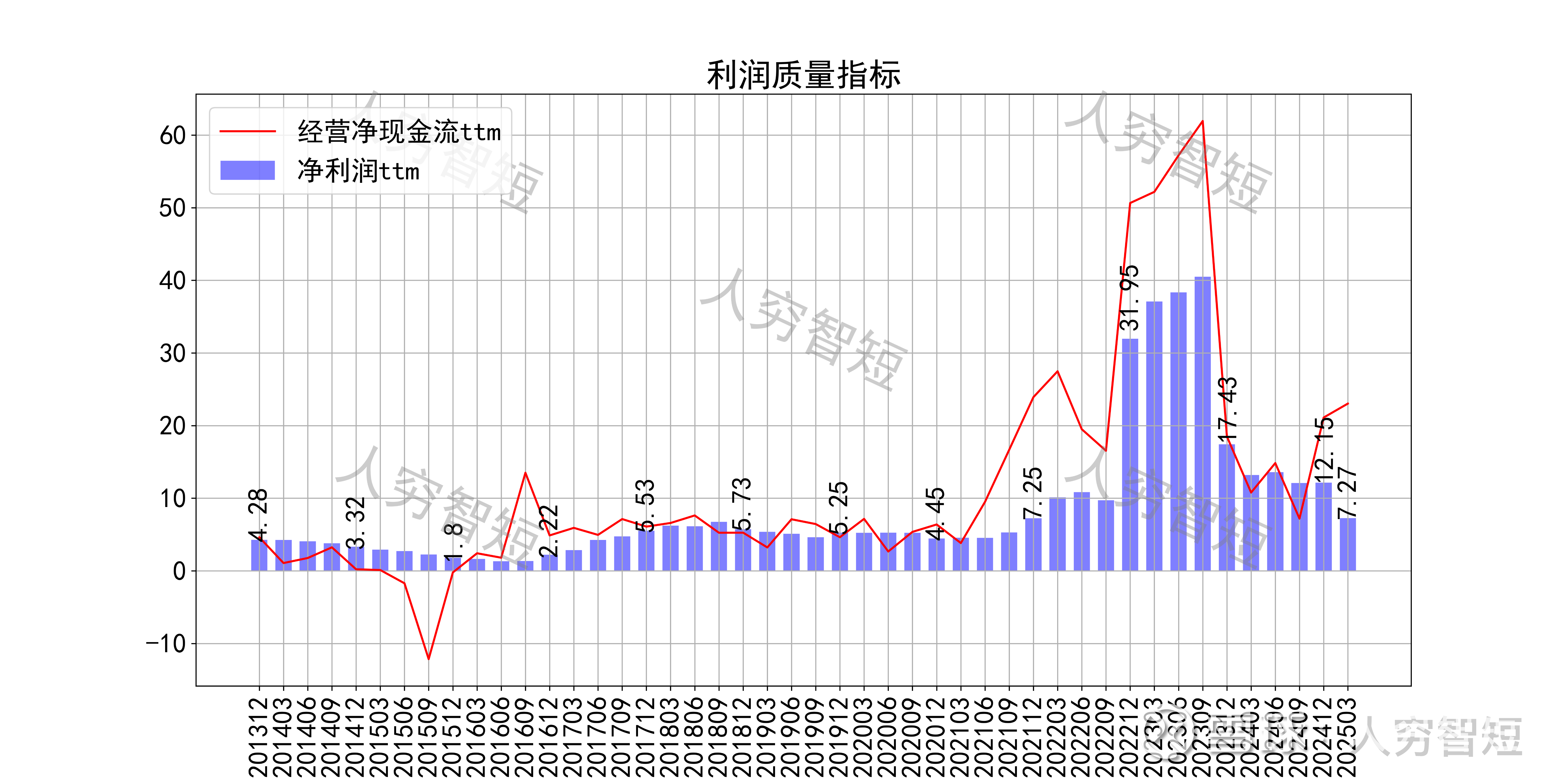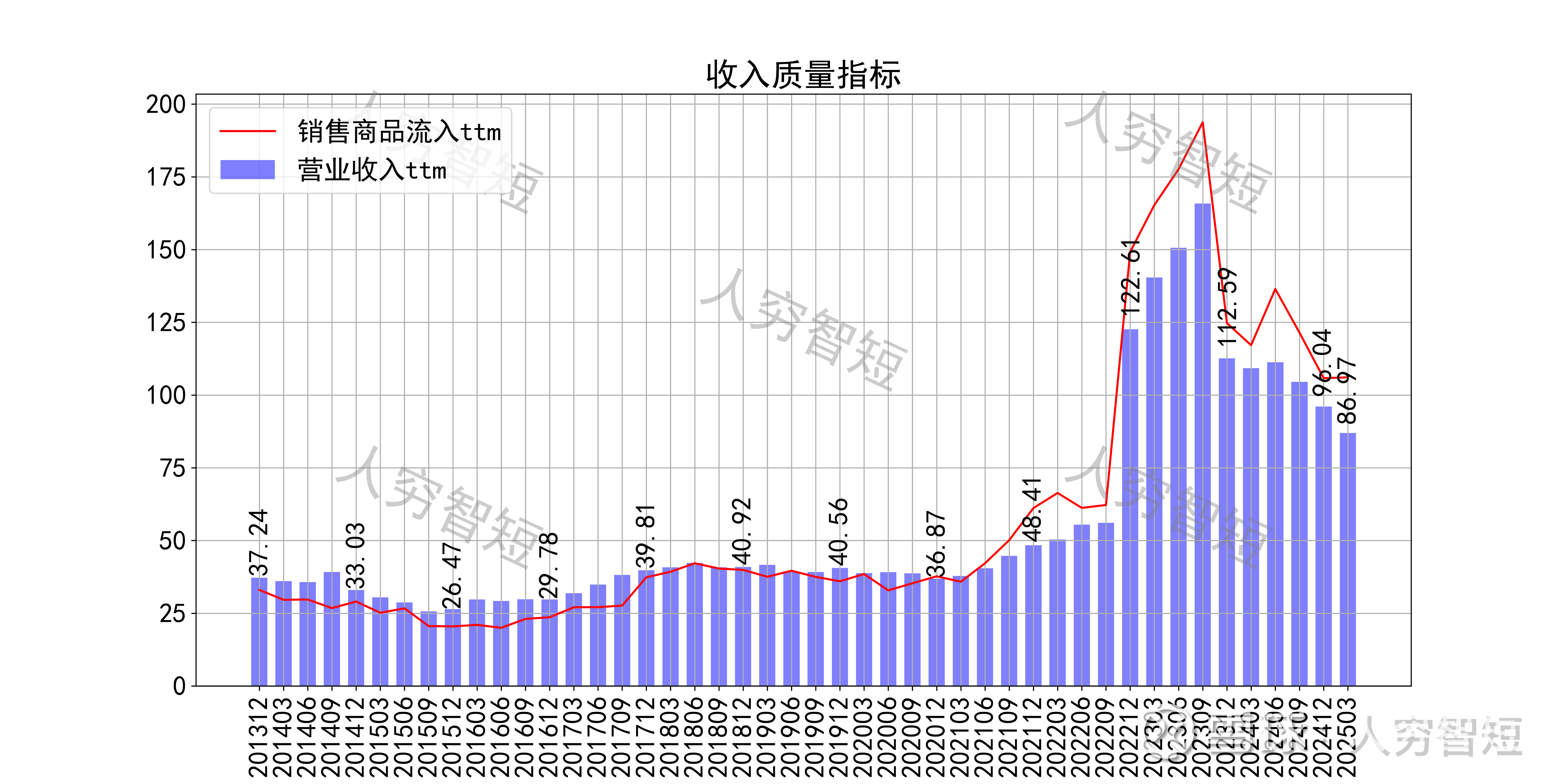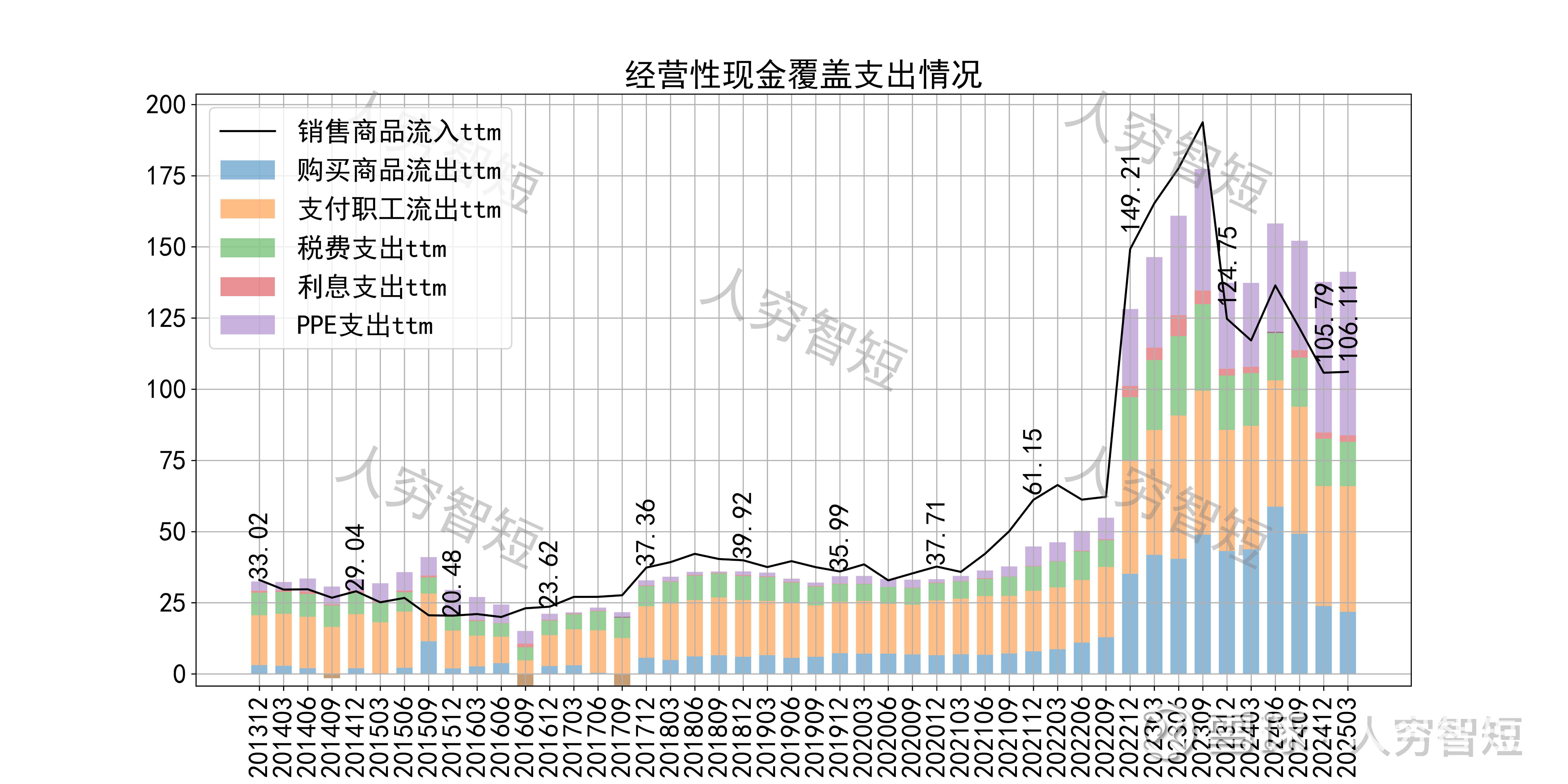 收入、利润的现金含量来看,近年来销售商品流入的现金流基本覆盖营业收入;经营现金流长期窄幅震荡,近期有所下滑,平均净额高于净利润,主要差异源于各项资产及长期费用折旧摊销(年约19亿元)、资产减值(2024年为2.6亿元)以及经营项目的变动等。