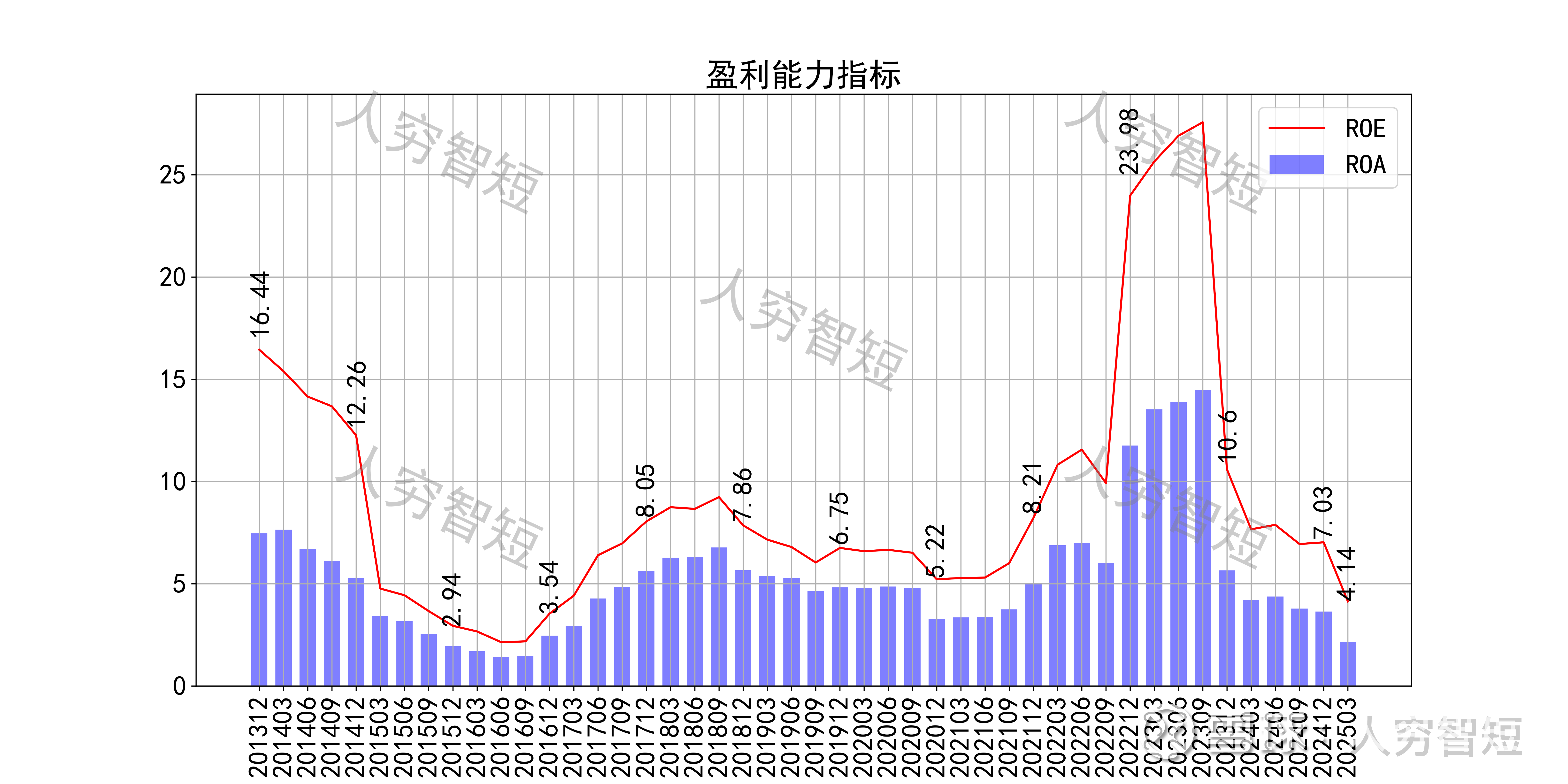 最近十年营收规模复合增长率约为5.63%,到24年末,TTM营业收入为8007亿元。成本费用端构成来看,营业成本占据主要地位,成本构成中主要为人工成本、折旧费用等,其余各项支出较小。整体毛利率震荡走低,近年来净利率相对平稳,处于历史中等水平。各项费用控制较差,销售费用、管理费用占比维持高位,带动整体成本费用占比偏高,其中管理费用主要为职工薪酬,年支出超过8.5亿元且持续增长;销售费用主要为职工薪酬,年支出超过5亿元且持续增长,相关支出过多。盈利指标ROE、ROA显示,盈利能力长期地位震荡,最新ROE在1.98%左右。