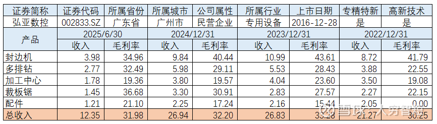 弘亚数控是国内家具装备研发、生产、销售及服务的行业领军企业,主要向客户提供应用于板式家具、木门等多系列家具机械设备和自动化生产线,公司家具装备市场占有率排名全国第一、全球前五,核心品类封边、钻孔、裁切、加工中心份额全面领先。生产模式主要是对非标零部件自主加工制造及家具机械设备总成、整机的组装和调试,采用订单生产与计划生产相结合并保持合理库存方式,境内业务占比接近2/3但总体占比有所下滑;2025年半年度各明细产品中封边机、数控钻产销下滑较多。