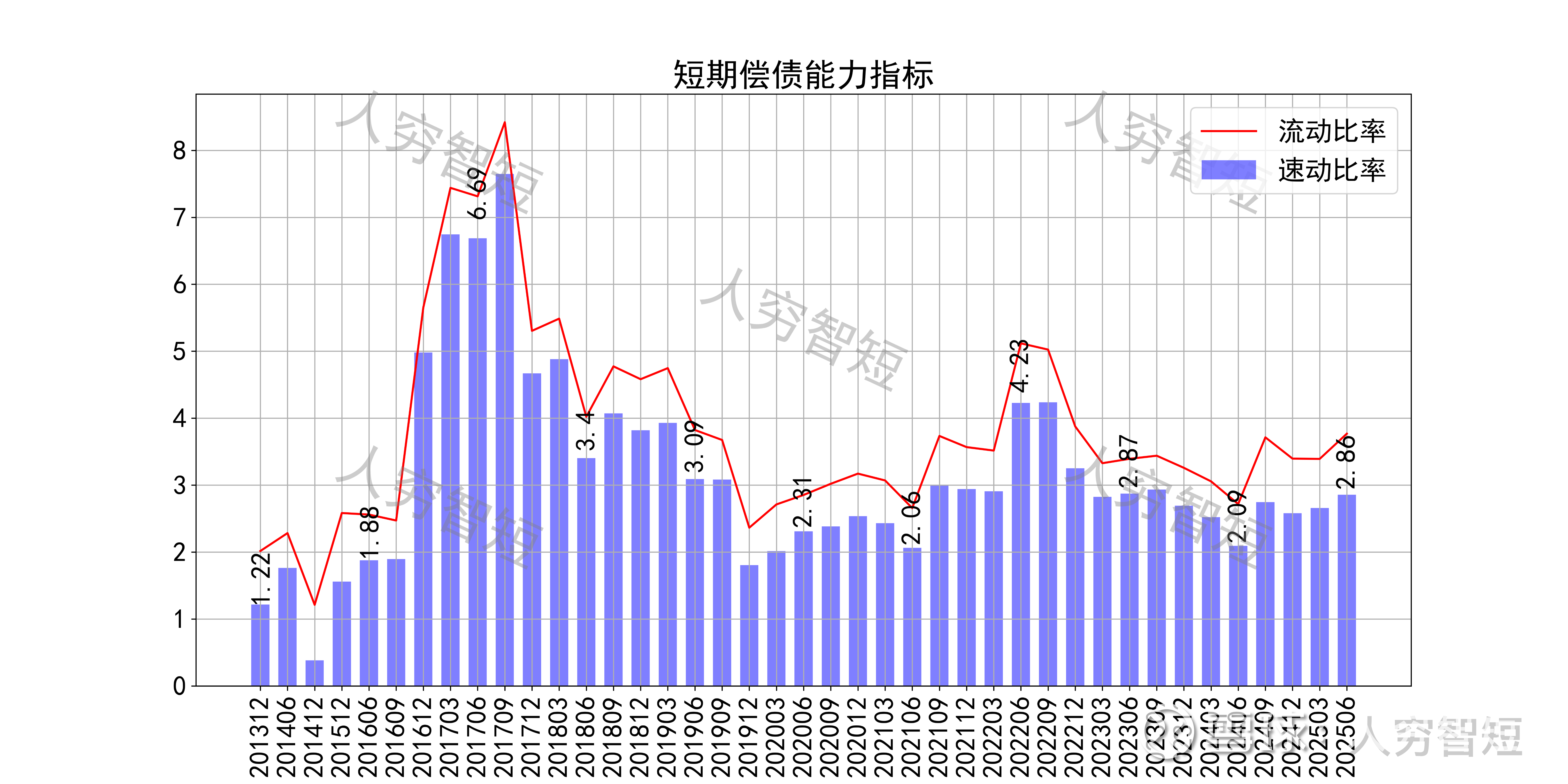 长期偿债指标中,资产负债率自底部持续抬升,近年增加至28%左右,有息负债率约为17.15%,债务负担一般,对供应链上、下游资金占用较弱。短期偿债指标中,流动比率、速动比率区间震荡,二者差异较小,主要系存货规模偏小所致,资产短期流动性较强。