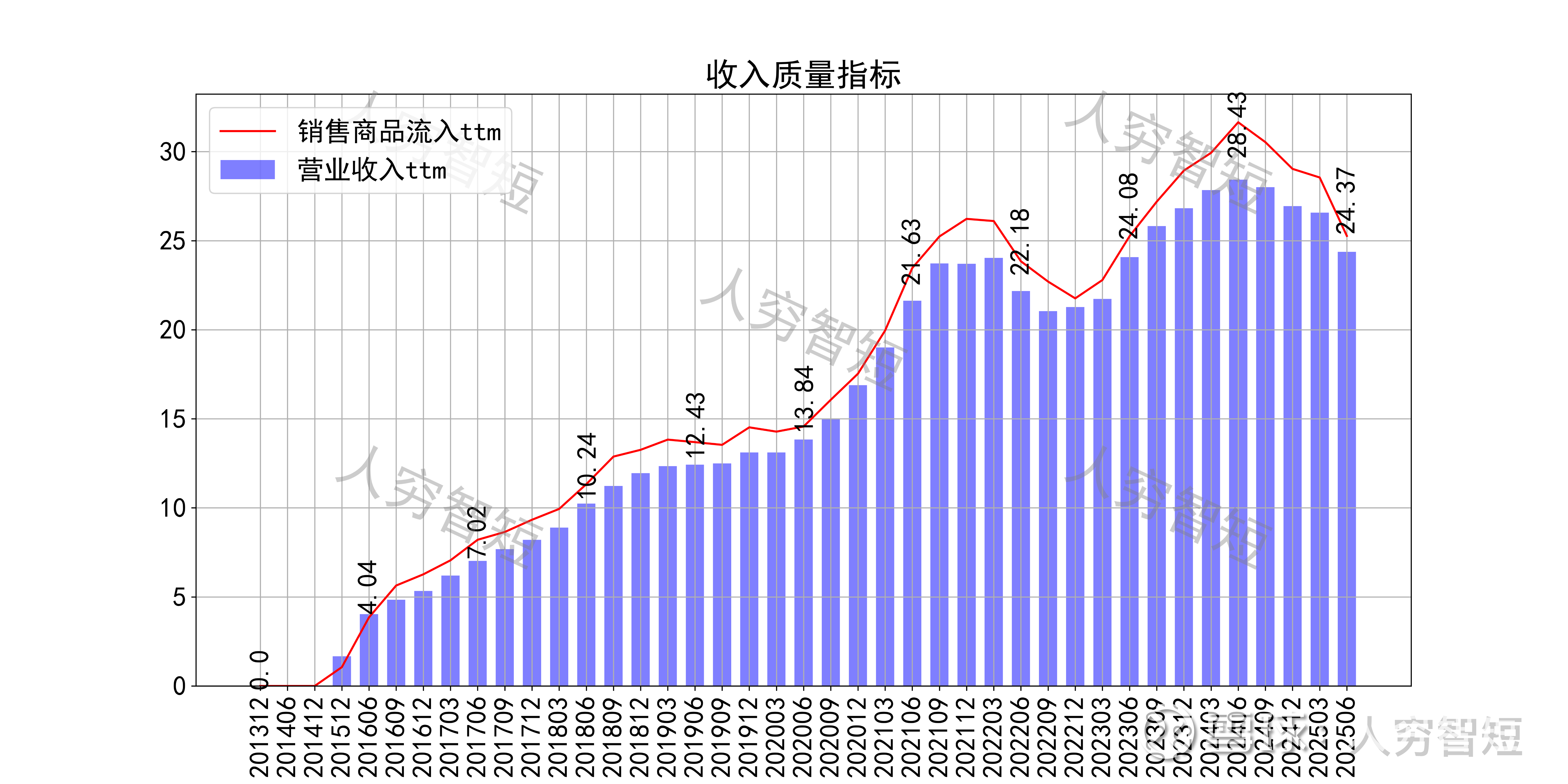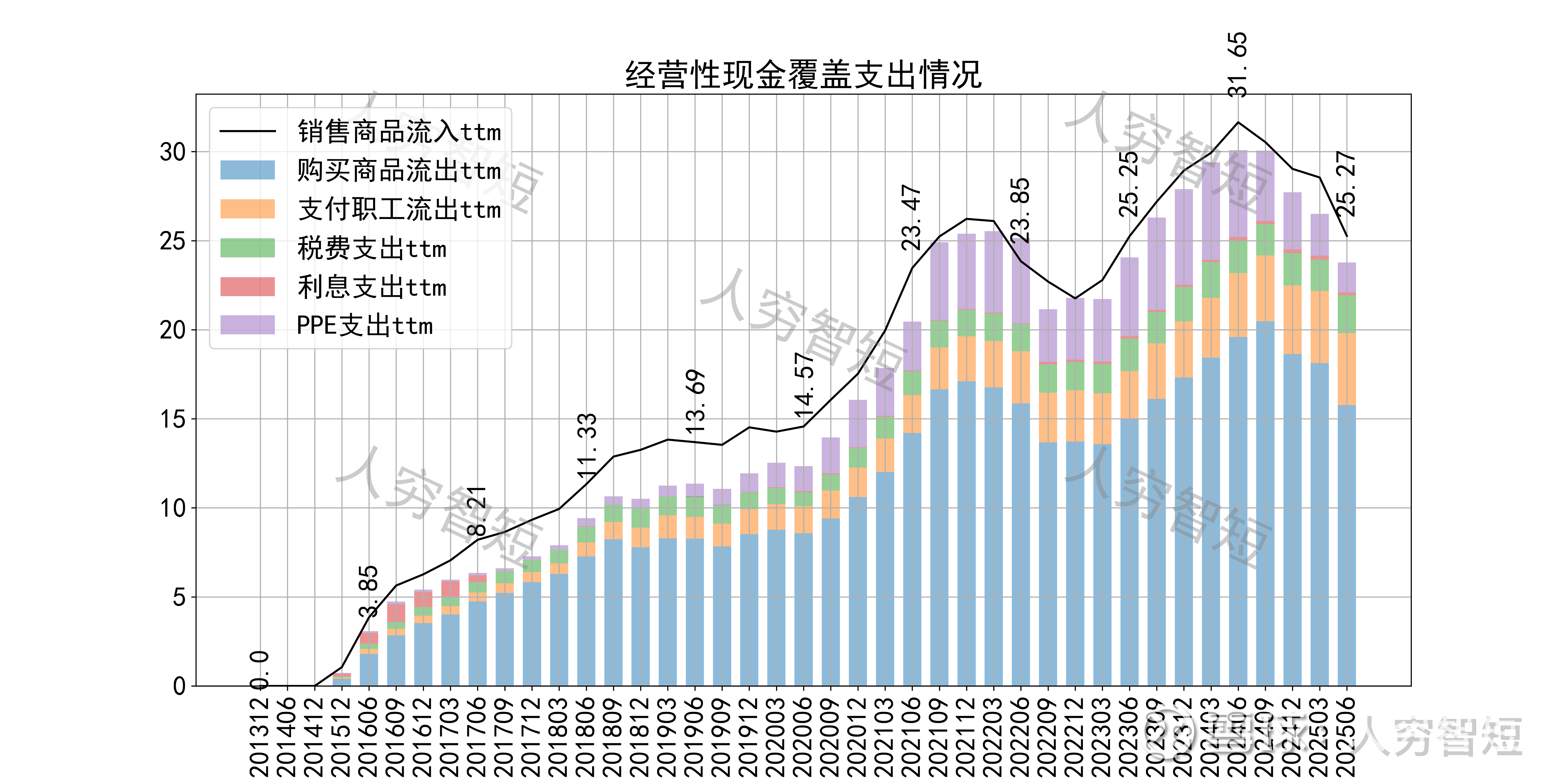 现金流收支方面,近几年销售商品获得的现金流足以满足日常的成本、费用以及扩大再生产,结余较好,随着近年来资金流入减少、资本支出增加,现金流结余高位下滑,目前为偏低水平。