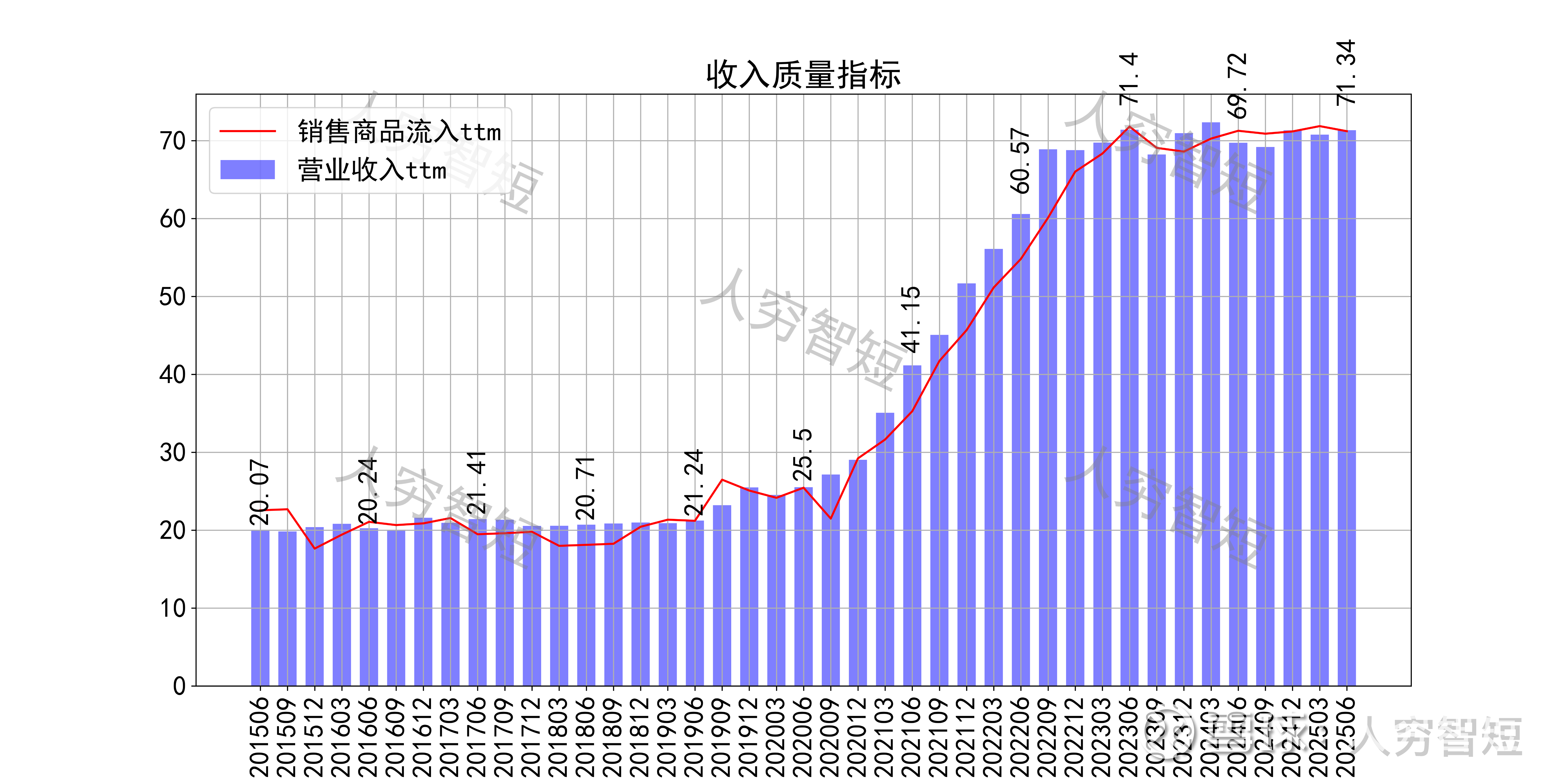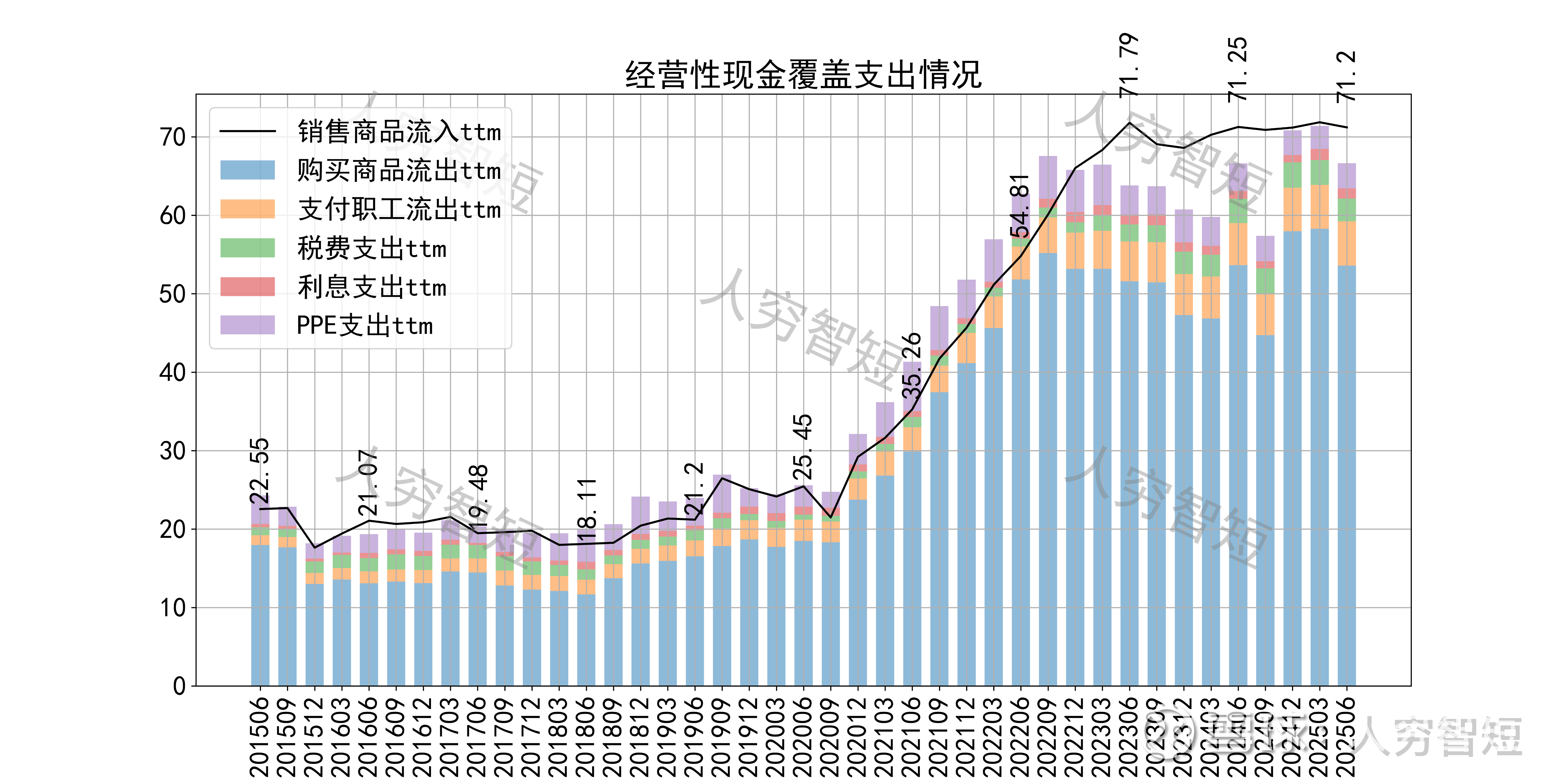 现金流收支方面,近几年销售商品获得的现金流足以满足日常的成本、费用以及扩大再生产,结余较好,随着近年来成本支出有所降低,现金流结余缓慢增加,目前为有一定回暖。