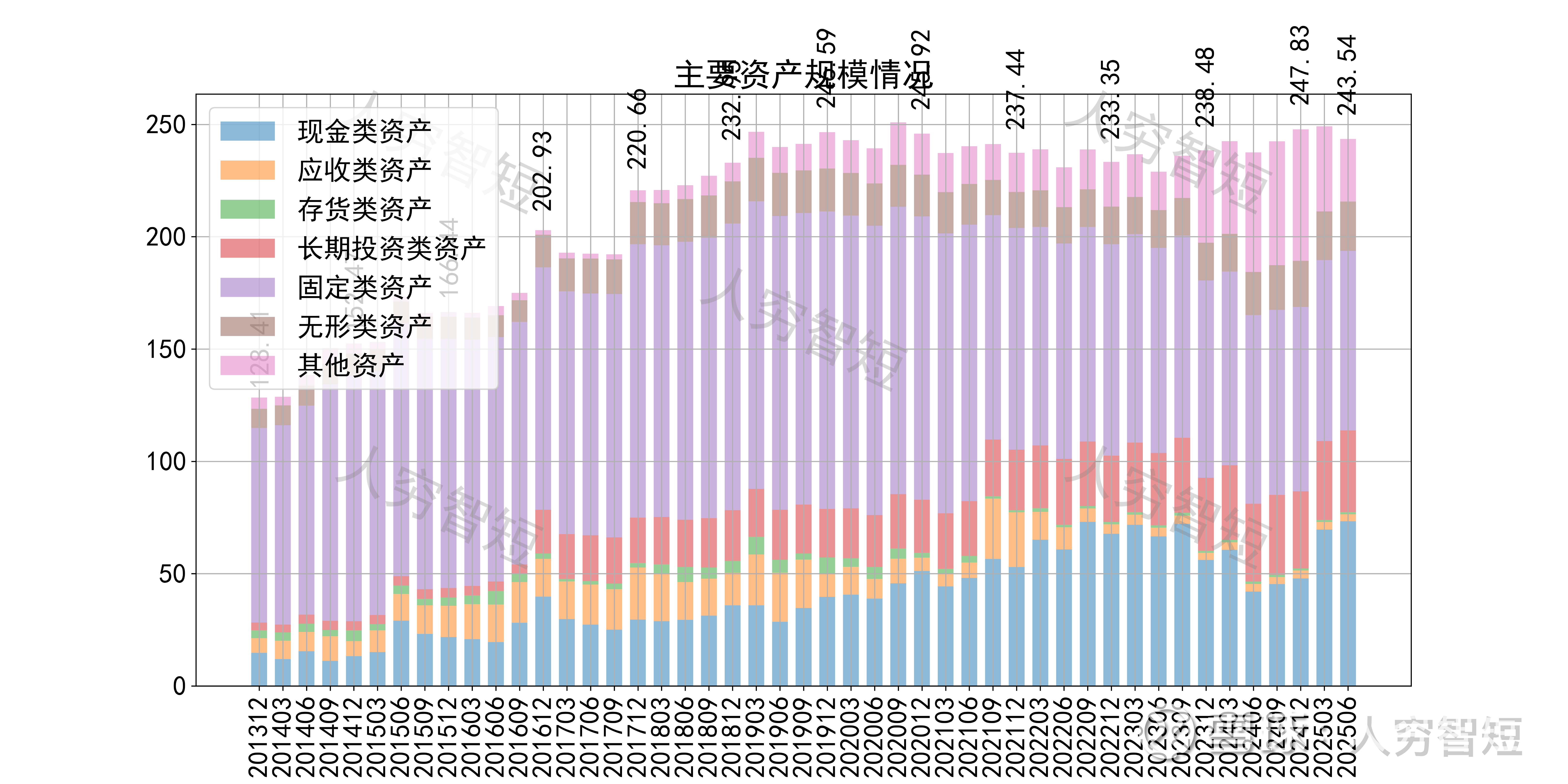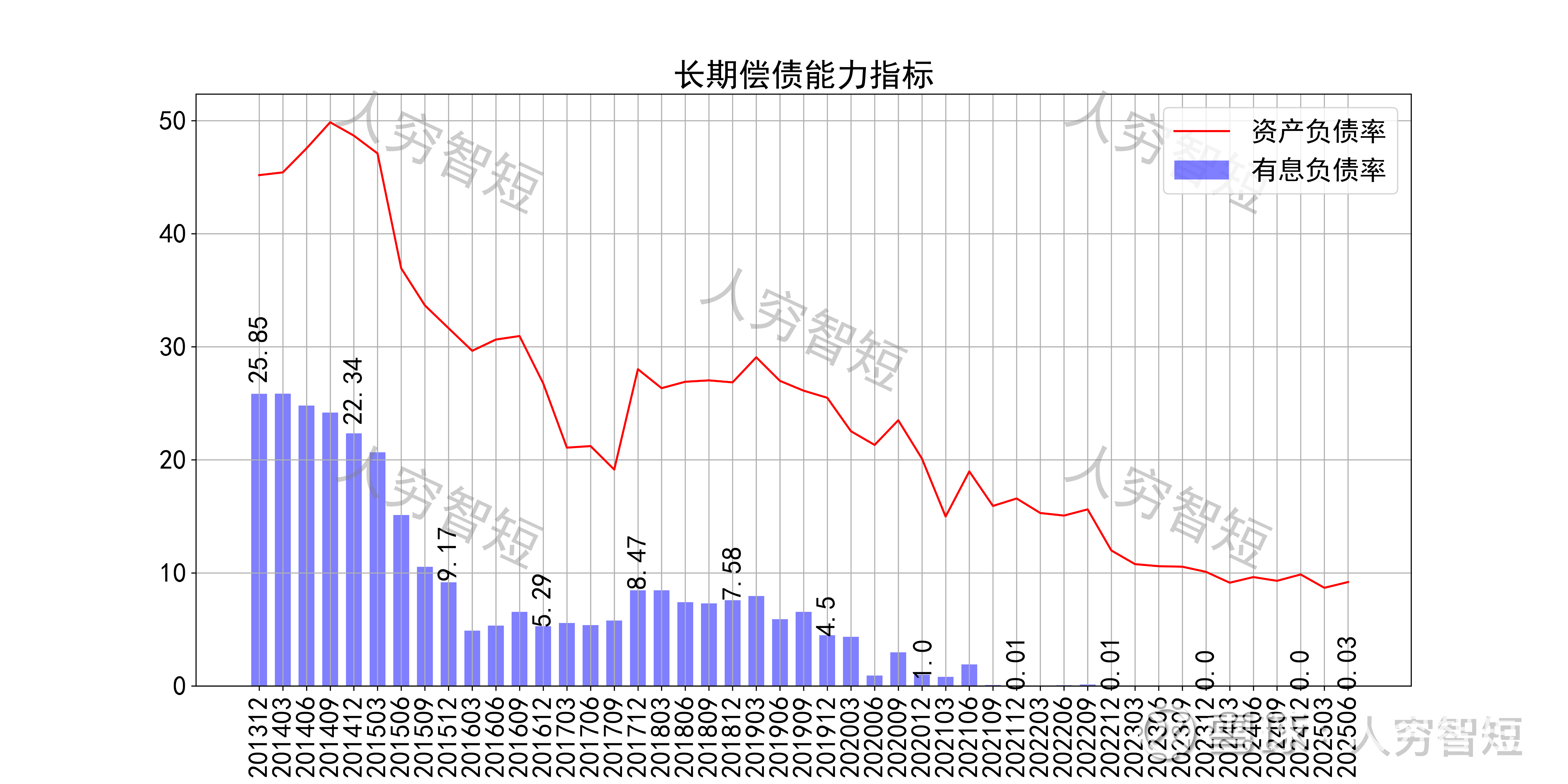 公司最近十年总资产复合增长率5.60%,截至25年6月末,为243.54亿元。资产结构以现金类资产、长期股权投资、固定资产、其他资产为主。长期股权投资36.34亿元,主要为对联营企业唐港铁路投资25.73亿元、曹妃甸实业投资7.14亿元,各项投资年贡献收益约2亿元,总体回报尚可。固定资产余额77.44亿元,主要为房屋建筑物53.34亿元,尚需折旧13年;机器设备23.19亿元,尚需折旧约10年;在建工程2.49亿元,主要为东港站路基桥涵工程及唐山港京唐港区51号、52号散货泊位工程,预计投资规模超过60亿元。其他资产主要为计入其他非流动资产的定期存款11.88亿元以及预付设备款6.52亿元,资产质量尚可。