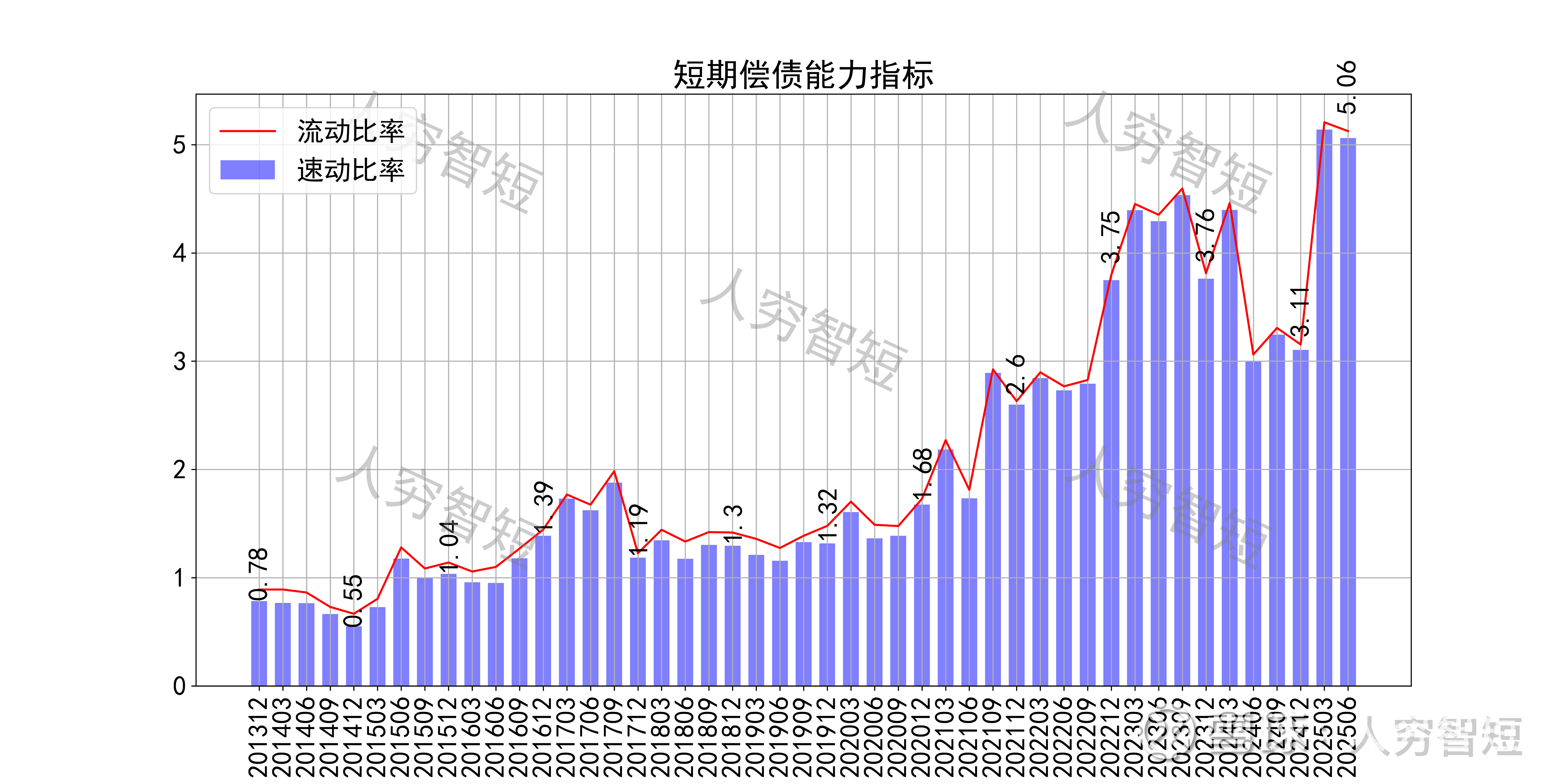 长期偿债指标中,资产负债率持续走低,近年减少至10%左右,有息负债率约为0.03%,几乎无债务负担,对供应链上、下游资金占用较弱。短期偿债指标中,流动比率、速动比率震荡走高,二者差异较小,主要系存货规模较小所致,资产短期流动性强。