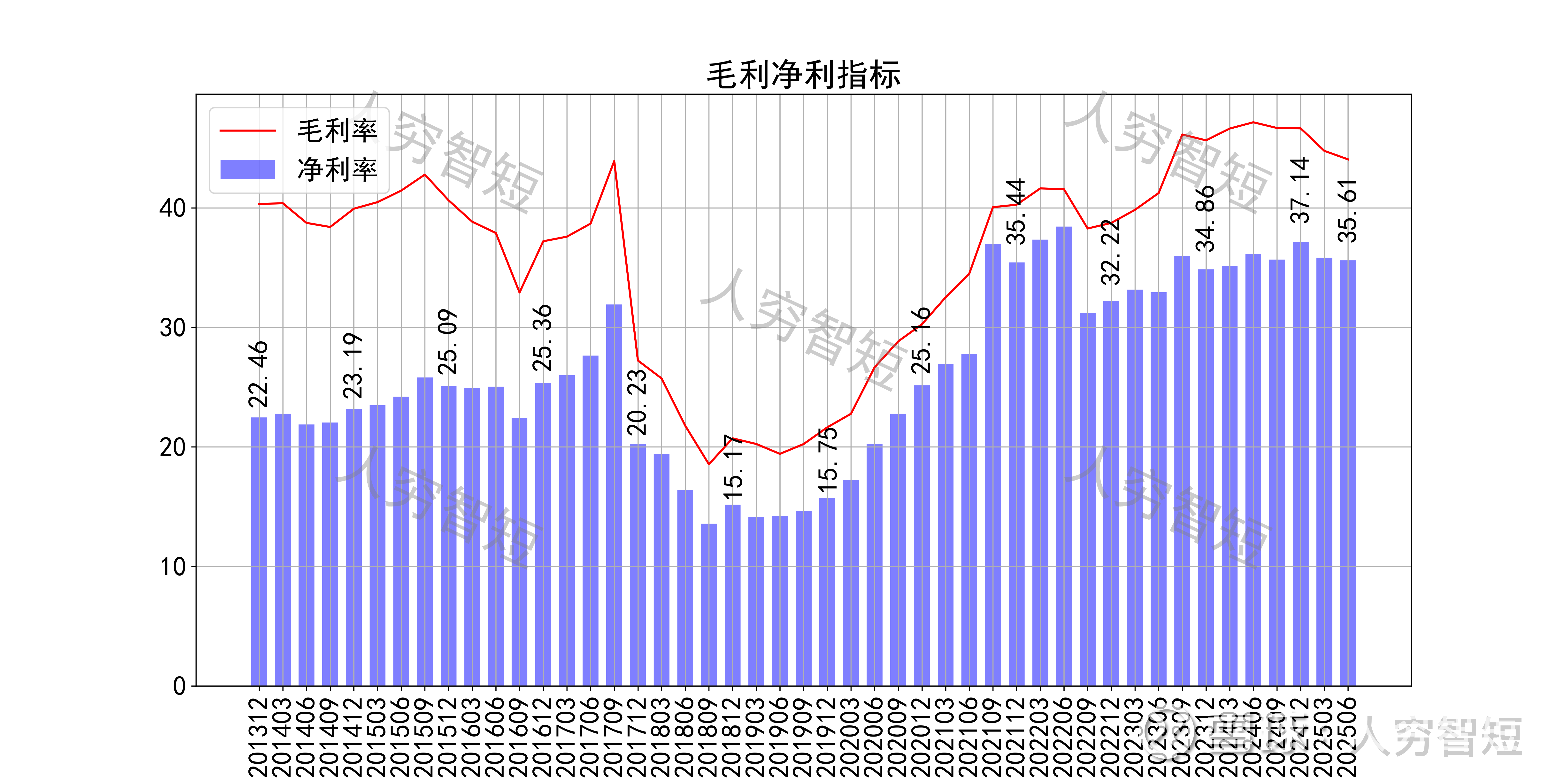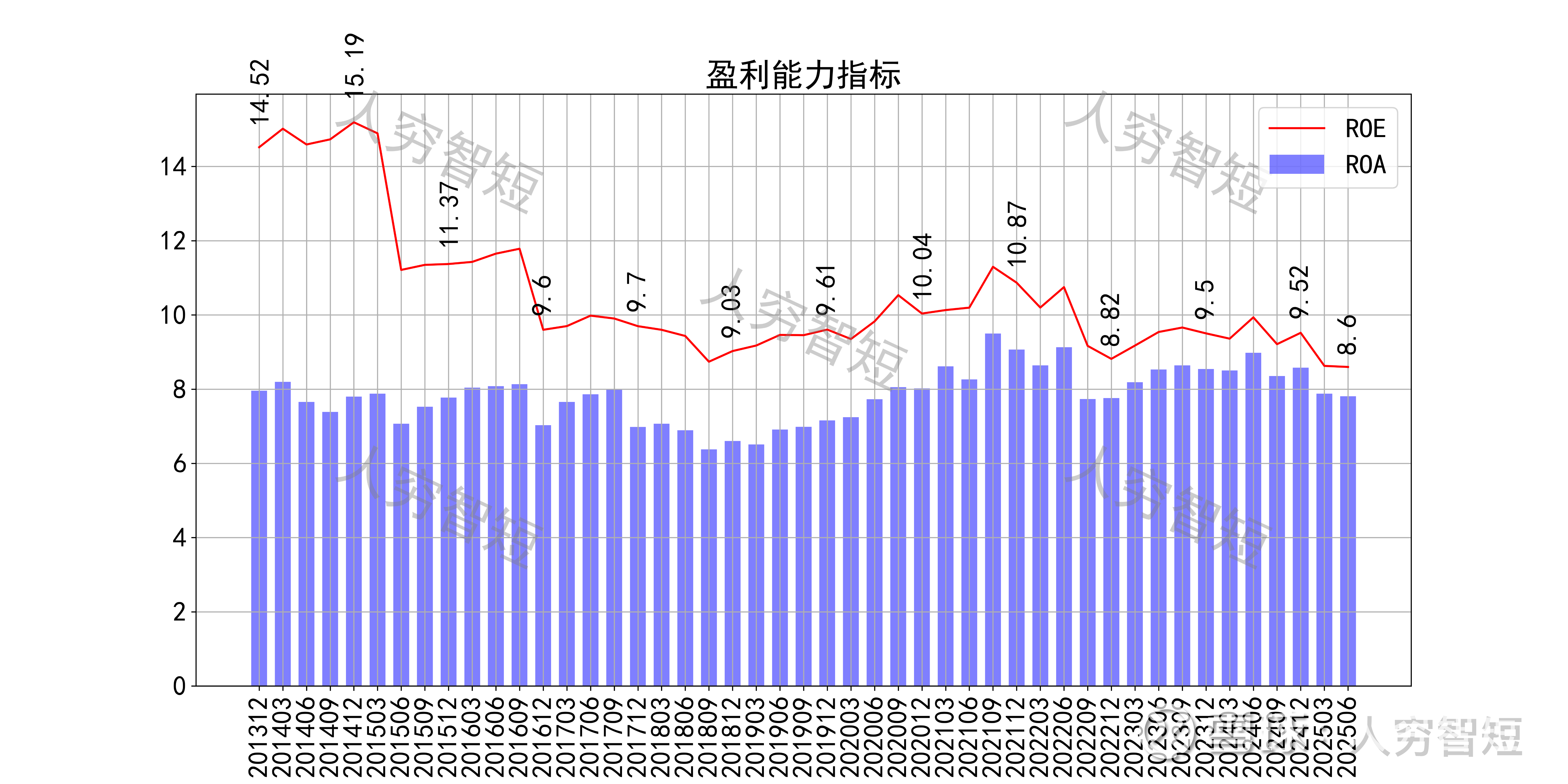 最近十年营收规模复合增长率约为1.37%,到25年6月末,TTM营业收入为53.39亿元,长期基本稳定。整体毛利率与收入规模成反向关系,近年来随收入水平回归维持平稳,净利率同步波动震荡走高,处于历史中等偏高状态。各项费用控制尚可,管理费用占比持续增长但财务费用为负,带动整体成本费用占比缓慢下滑。盈利指标ROE、ROA显示,盈利能力相对平稳,最新ROE在8.60%左右。