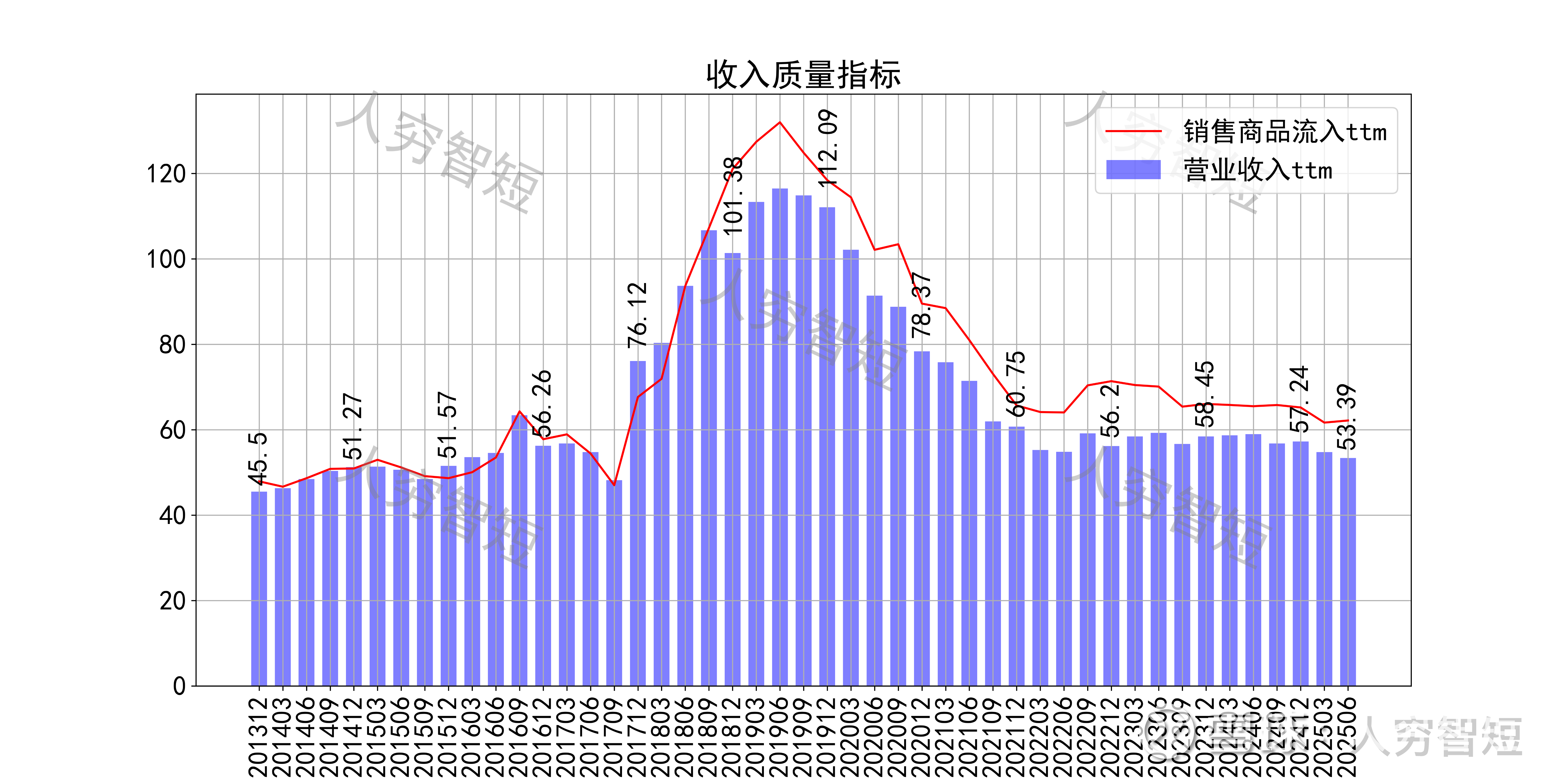 收入、利润的现金含量来看,近年来销售商品流入的现金流完全覆盖营业收入;经营现金流波动较大,平均净额基本与净利润一致。