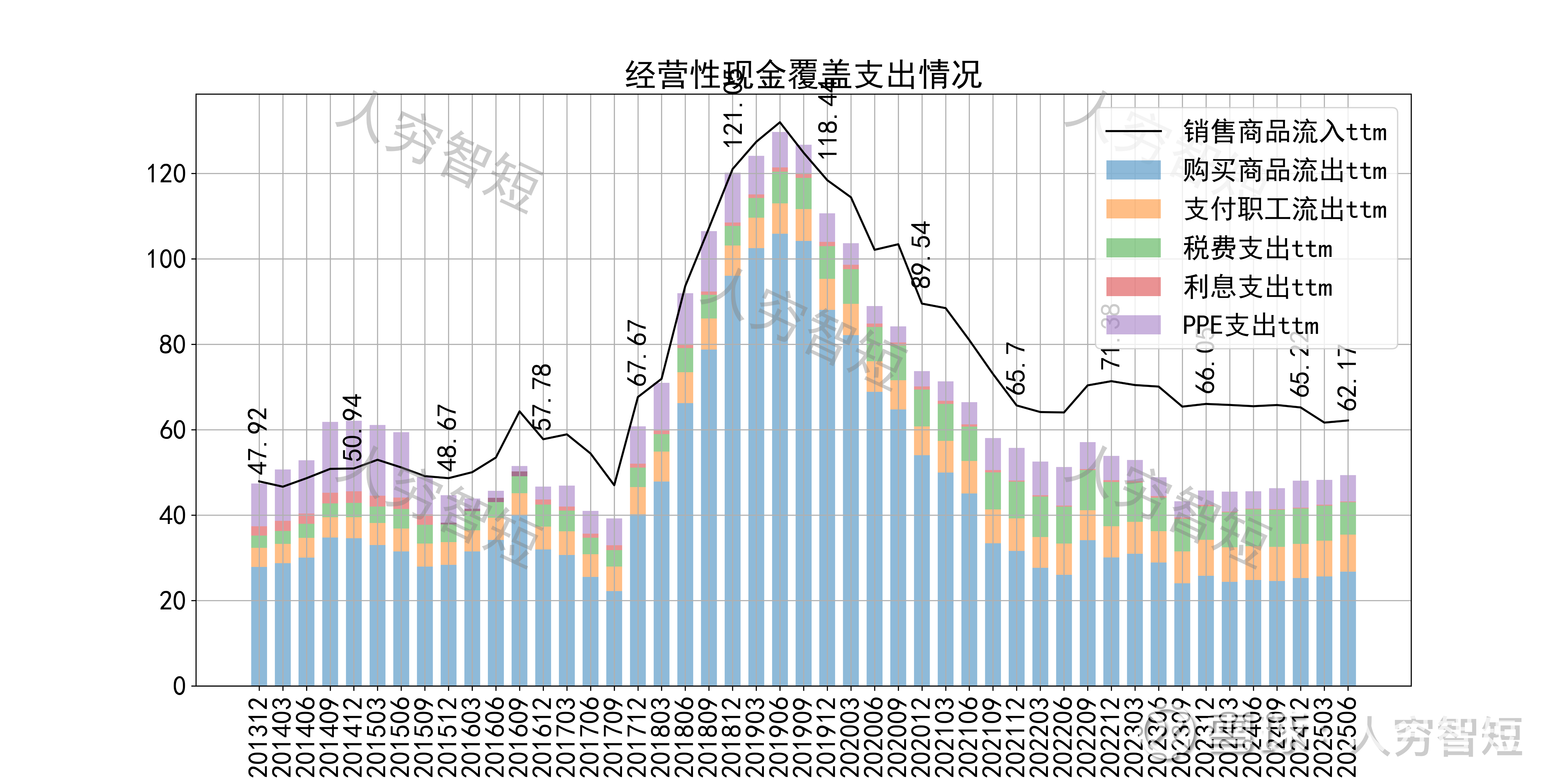 现金流收支方面,近几年销售商品获得的现金流足以满足日常的成本、费用以及扩大再生产,结余较好,随着近年来成本支出有所增加,现金流结余缓慢下滑,目前仍为历史较好水平。