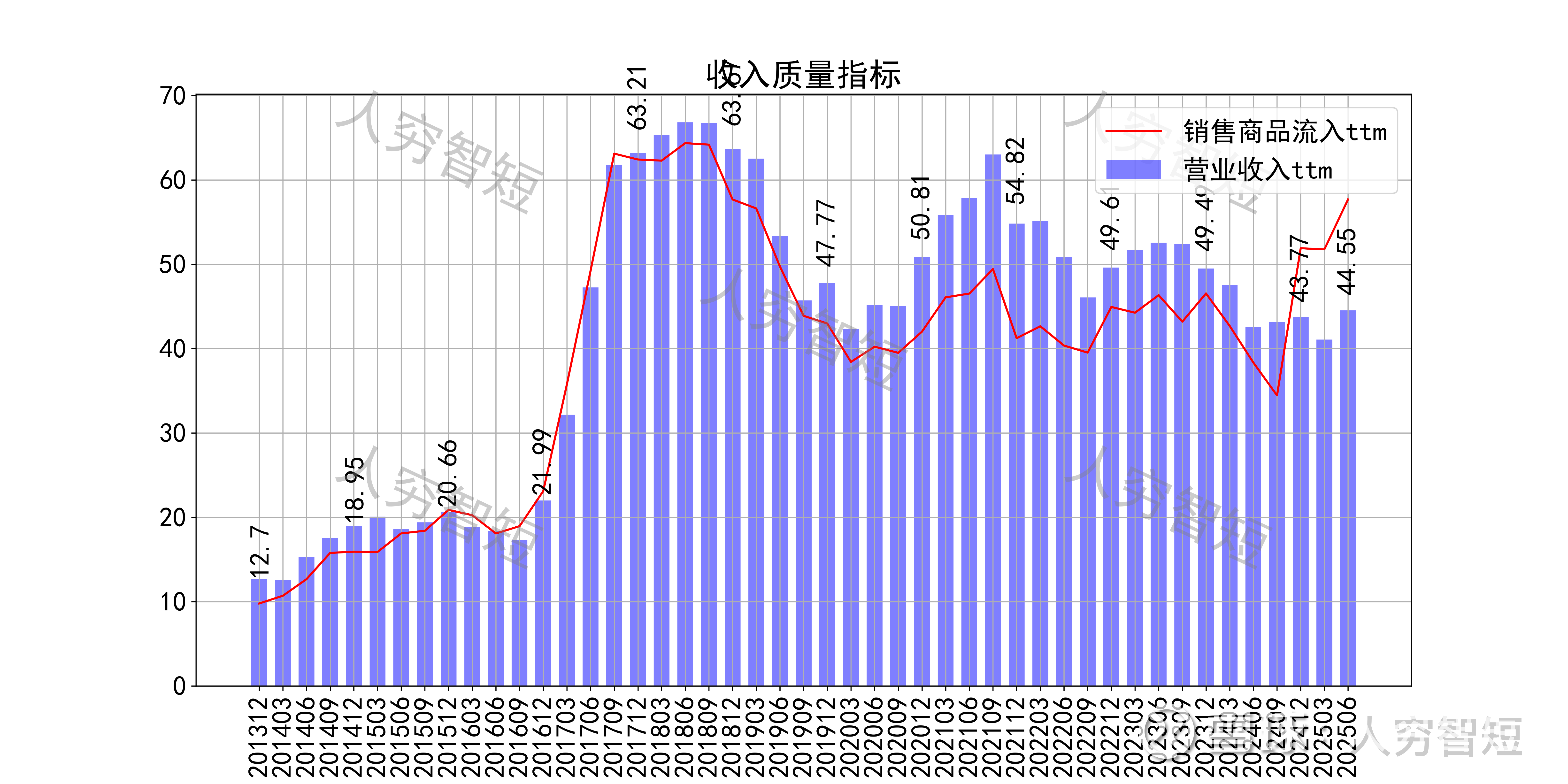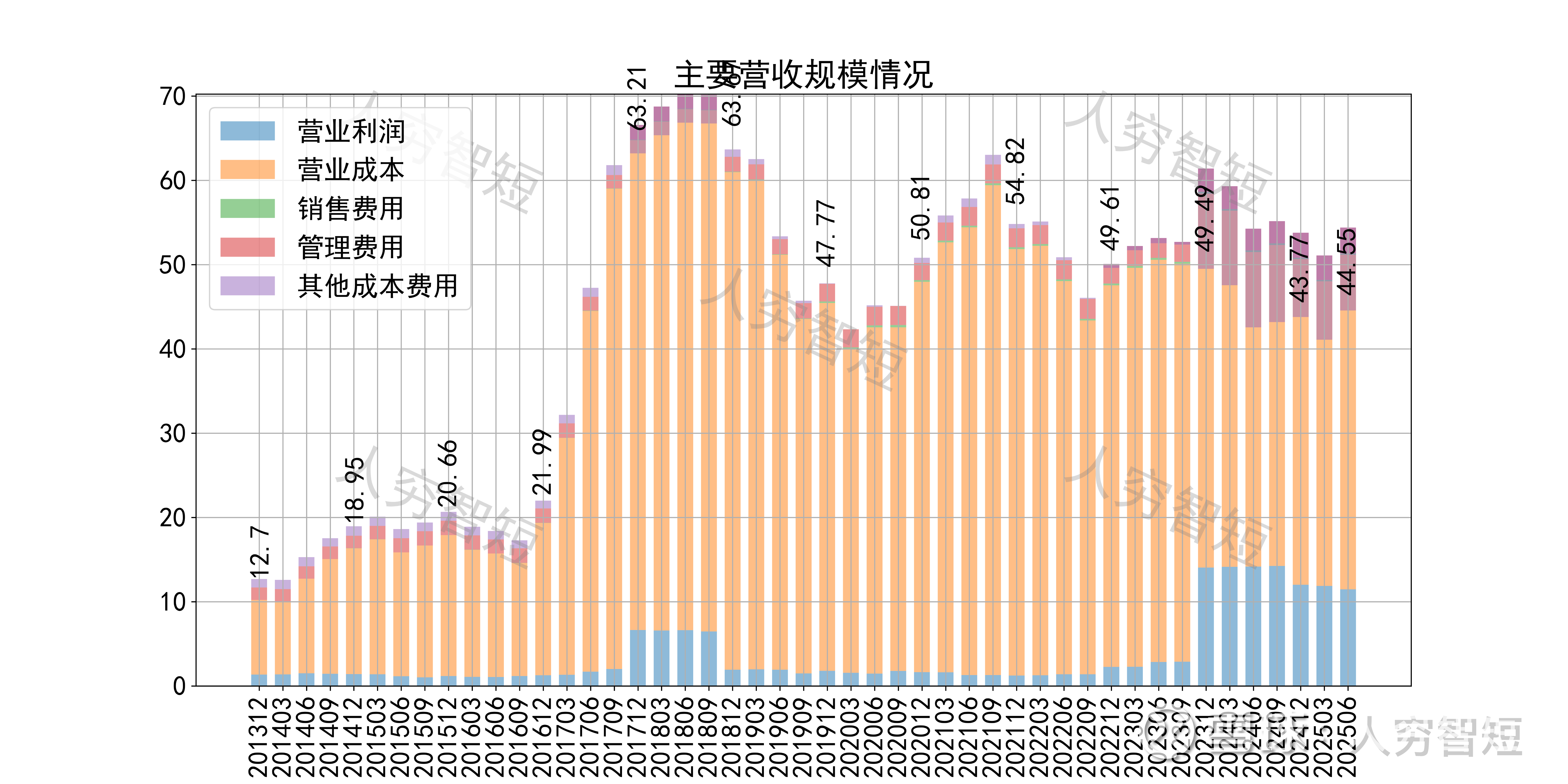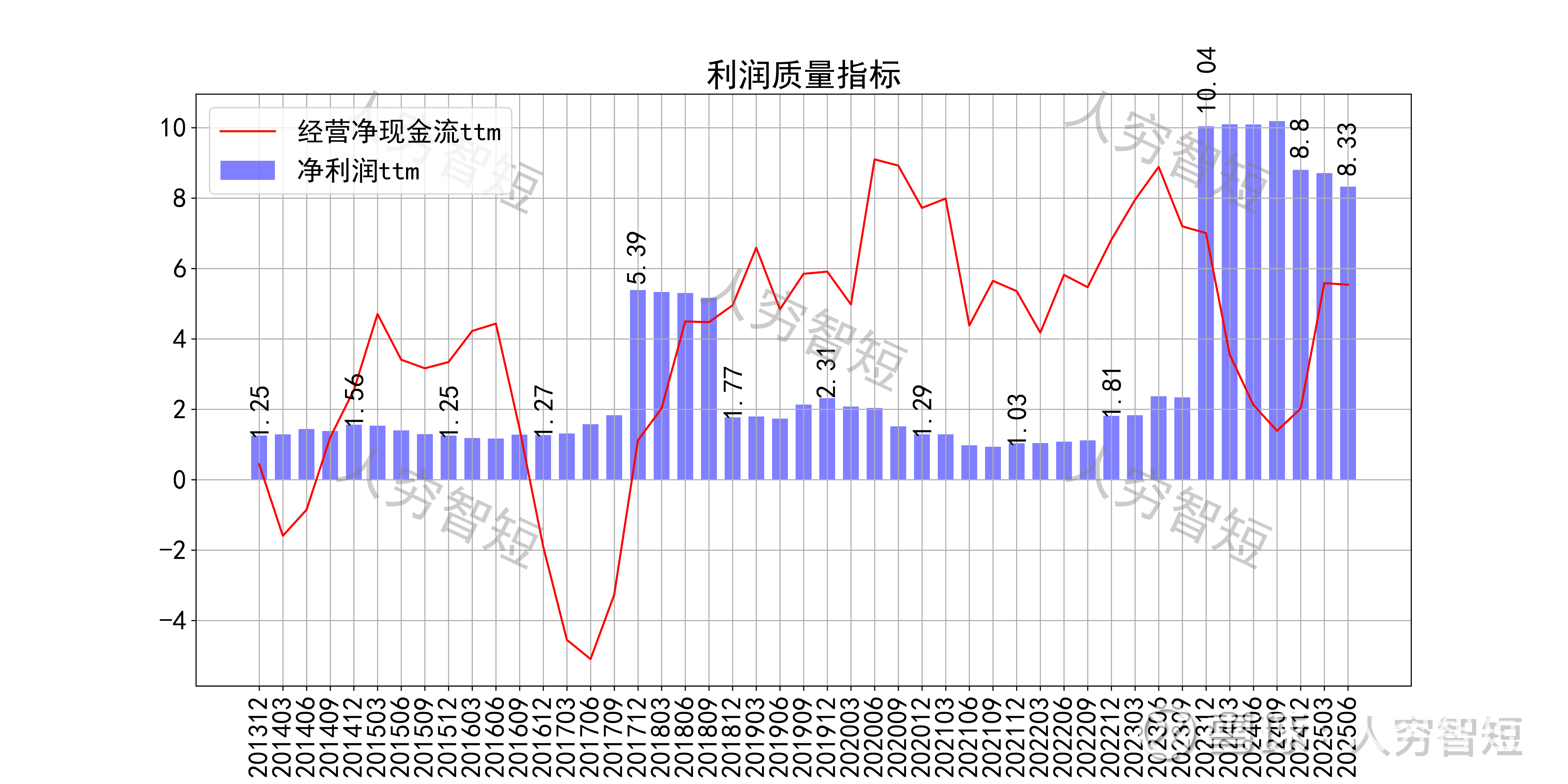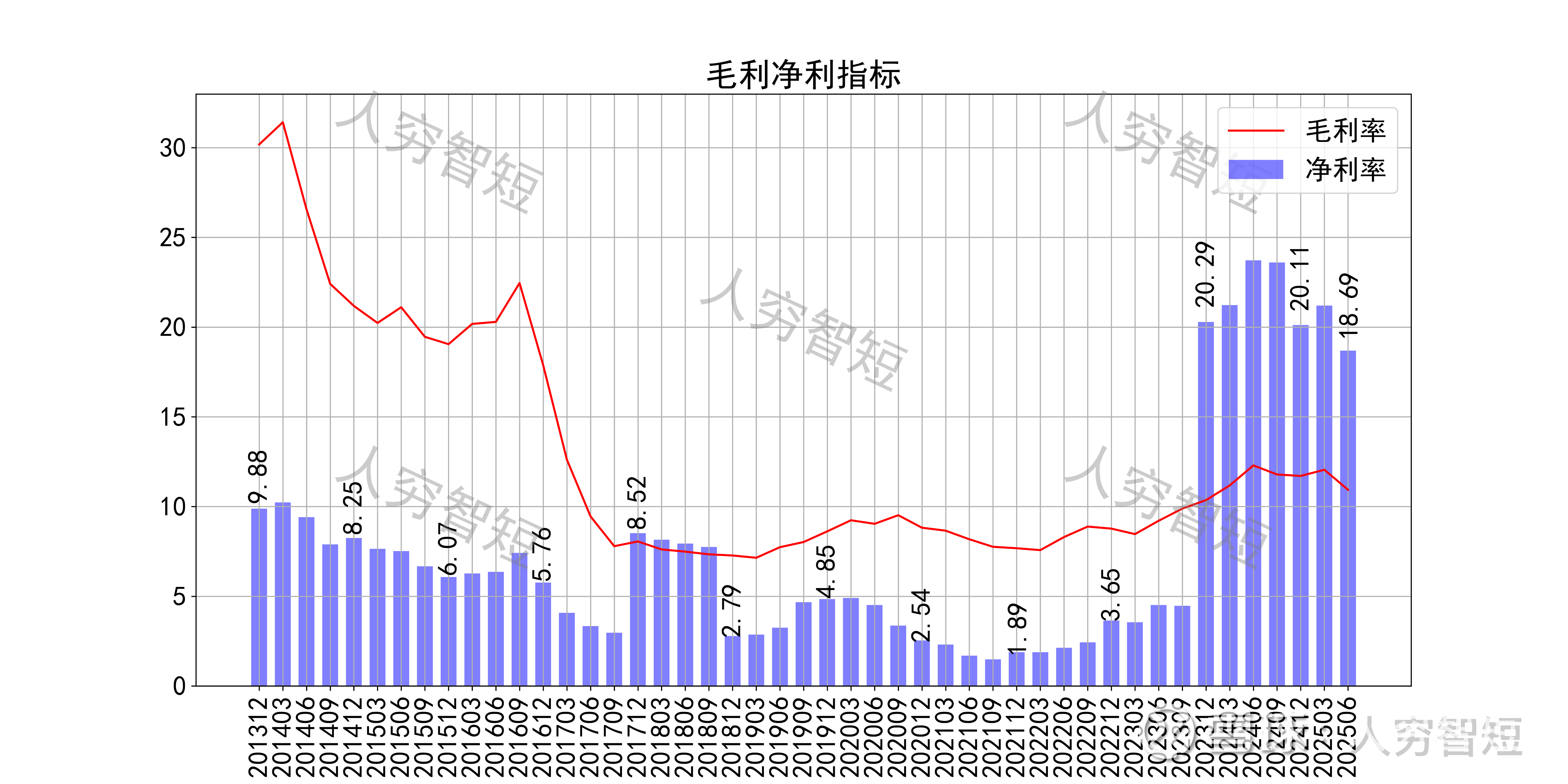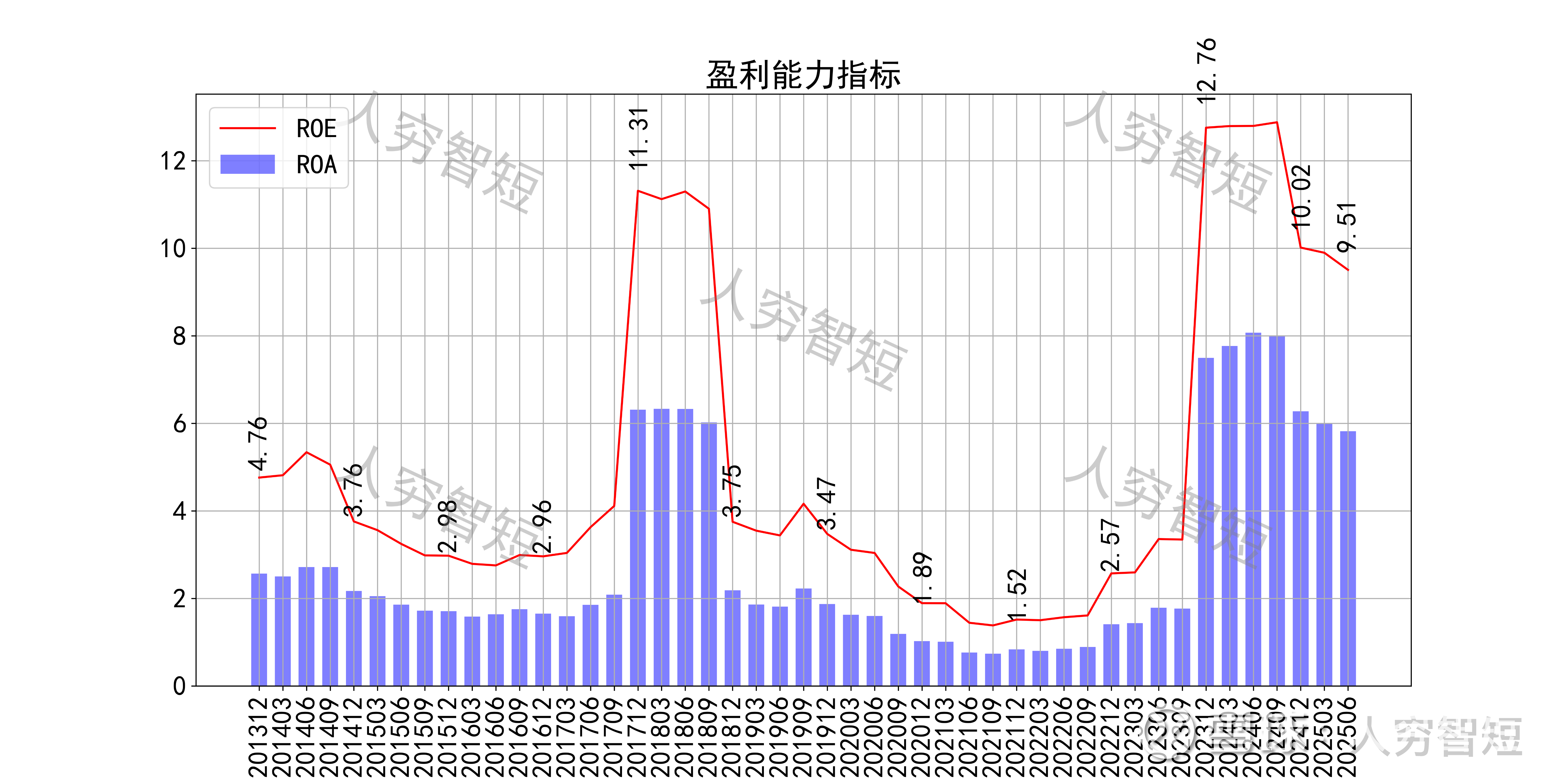 最近十年营收规模复合增长率约为11.27%,到25年6月末,TTM营业收入为44.55亿元。成本费用端构成来看,营业成本占据主要地位,成本构成主要为商品贸易的成本支出、装卸的人工及折旧费用、物流业务的联运费用代理费用等。毛利率整体低位波动,或与业务构成中商品贸易占比过高有关,近年来净利率异常提升,主要系土地等资产处置获得大规模的政府补偿拆迁款所致,持续性差。各项费用控制一般,管理费用占比维持一定水平,带动整体成本费用占比有所增加。盈利指标ROE、ROA显示,盈利能力自底部快速抬升,最新ROE在9.51%左右,基本无持续性。