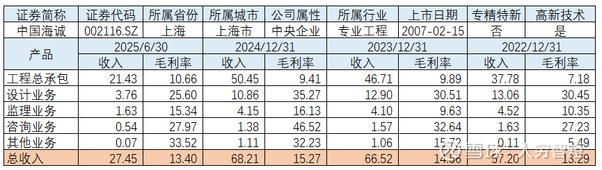 中国海诚主要从事轻工业专业工程设计服务相关业务,业务模式以总承包为主,咨询、监理为辅。下游轻工业包括制浆造纸、食品发酵、制糖工业、烟草酿酒、精细化工等传统领域,并逐步开拓生物医药、新能源新材料、能源环保等业务。2025年上半年,公司收入规模27.45亿元,同比增长11.61%,结构上体现为总承包增长、工程设计监理咨询等服务下滑;新签订单42.09亿元,同比减少8.93%,结构上总承包及监理业务下滑较多,设计、咨询业务维持一定水平订单;行业分布以造纸、食品为主,约2/3订单位于国内。