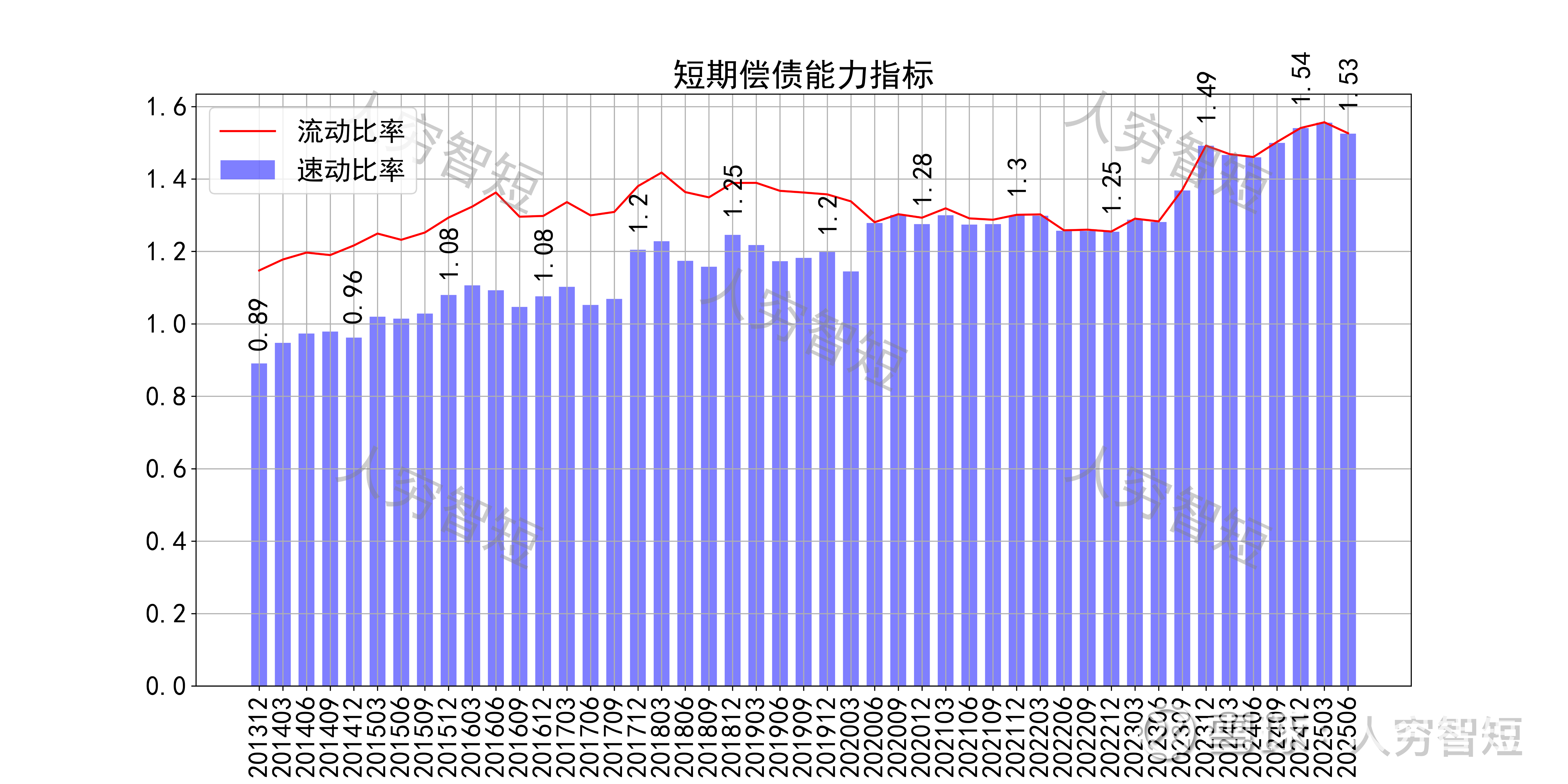 长期偿债指标中,资产负债率震荡走低,近年减少至60%左右,有息负债率约为0.29%,几乎无债务负担,对供应链上、下游资金占用较强。短期偿债指标中,流动比率、速动比率持续走高,二者差异减少,主要系会计上存货及合同资产核算分离所致,资产短期流动性强。