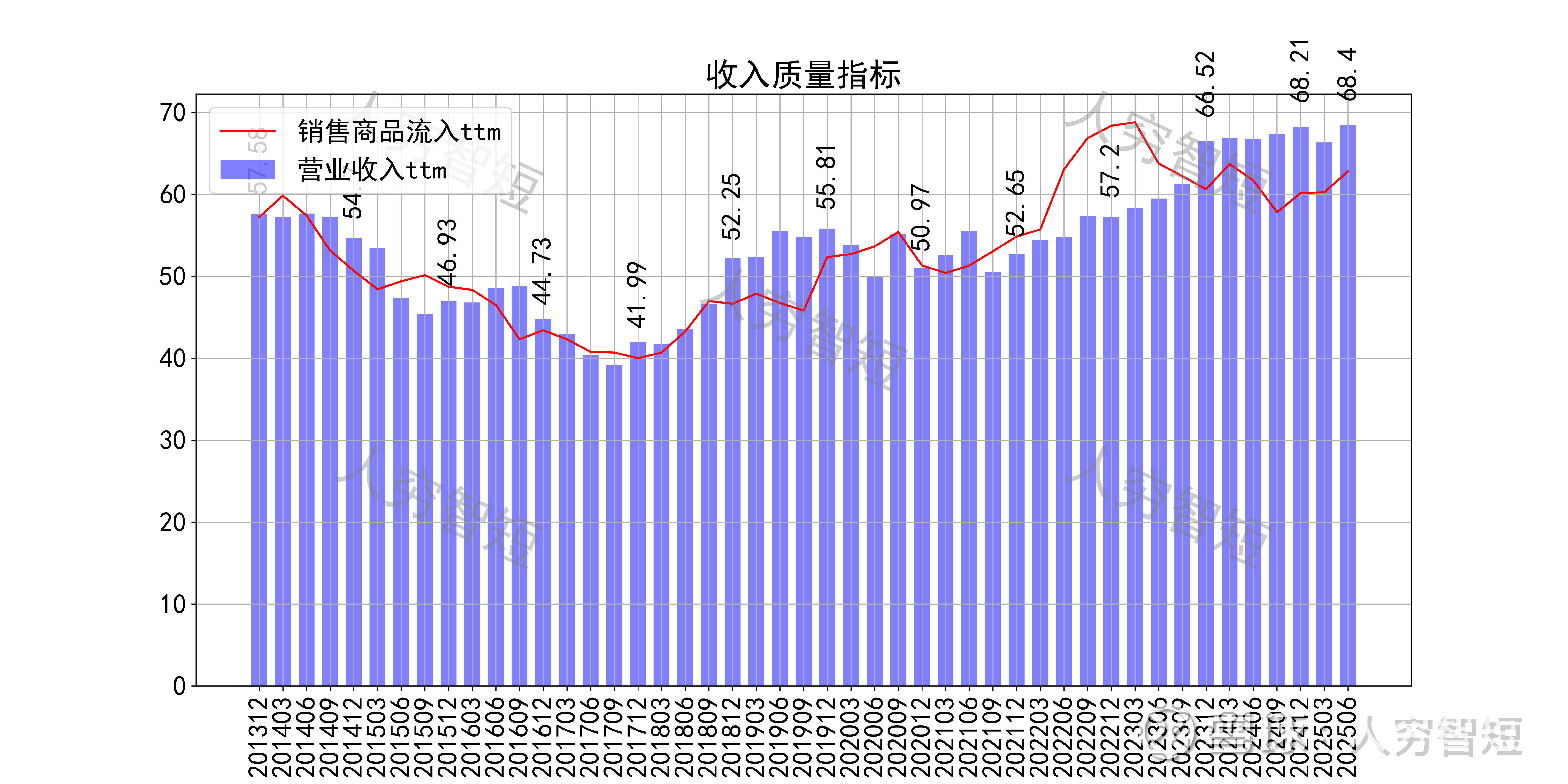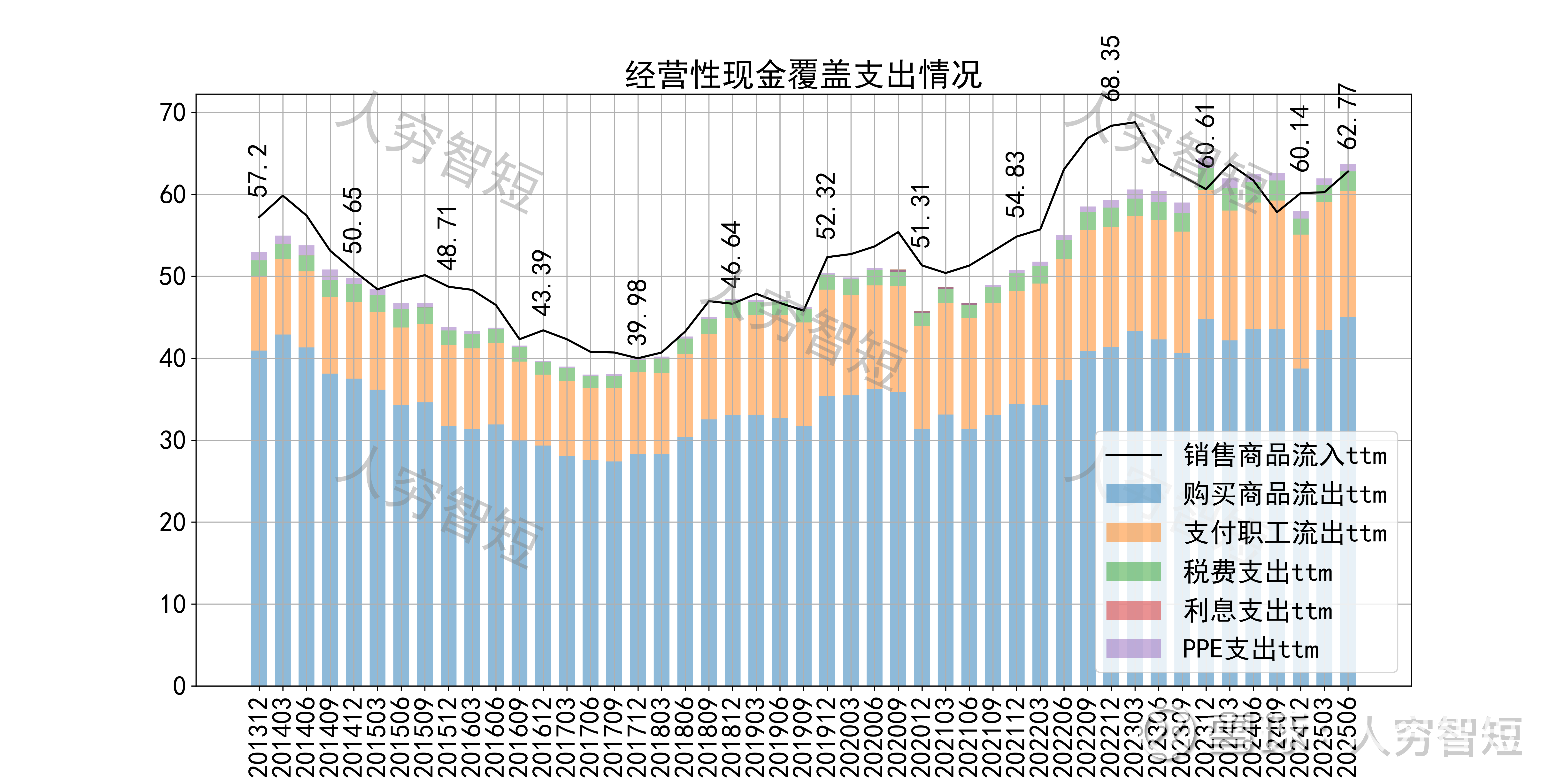 现金流收支方面,近几年销售商品获得的现金流足以满足日常的成本、费用以及扩大再生产,结余尚可,随着近年来现金流入情况转差,现金流结余一般,目前接近平衡点。