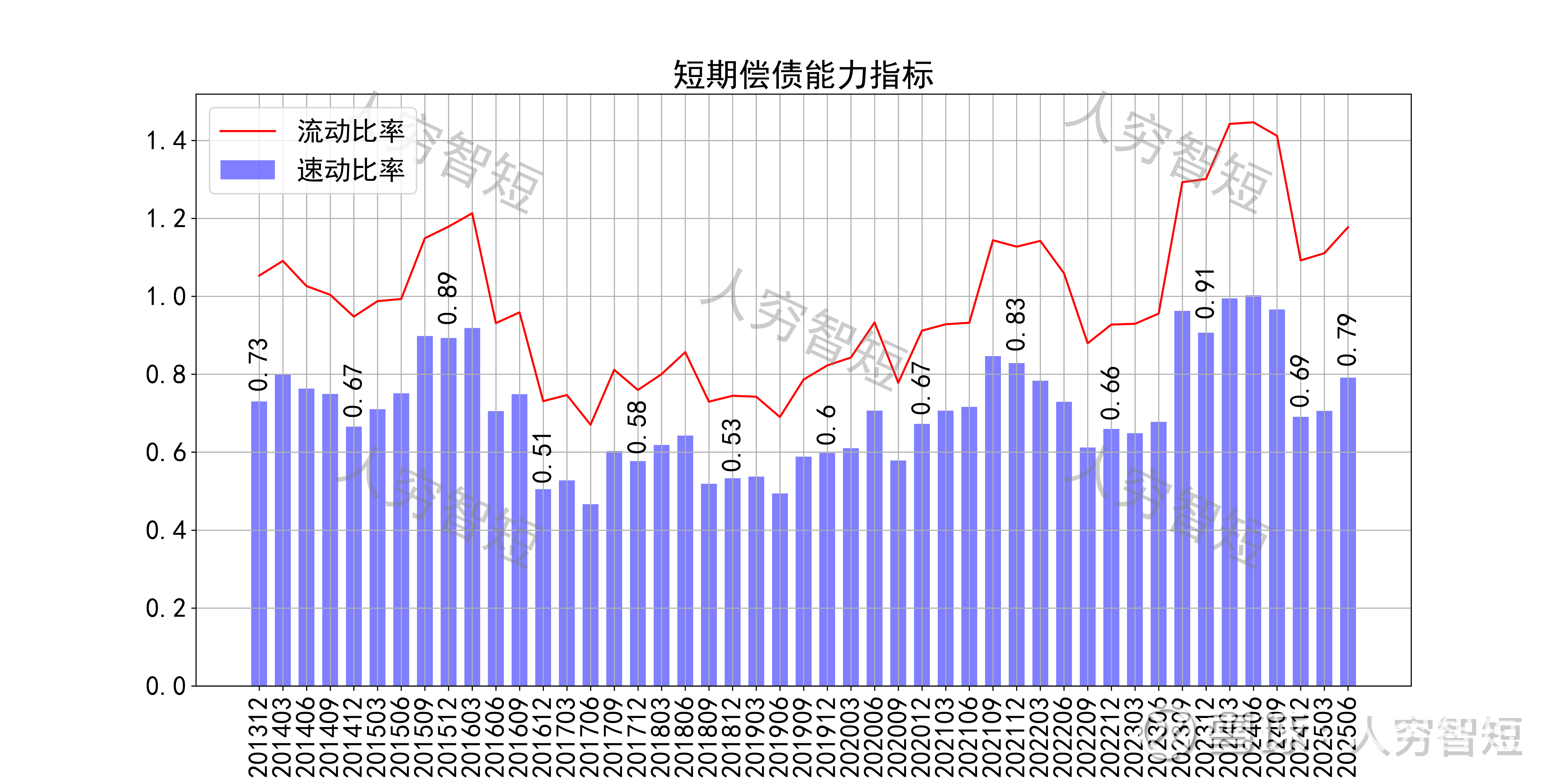 长期偿债指标中,资产负债率高位下滑,近年减少至55%左右,有息负债率约为22.51%,有一定的债务负担,对供应链上、下游资金占用较弱。短期偿债指标中,流动比率、速动比率周期性波动,二者有一定差异且较弱,主要系存在一定规模存货所致,资产短期流动性弱。