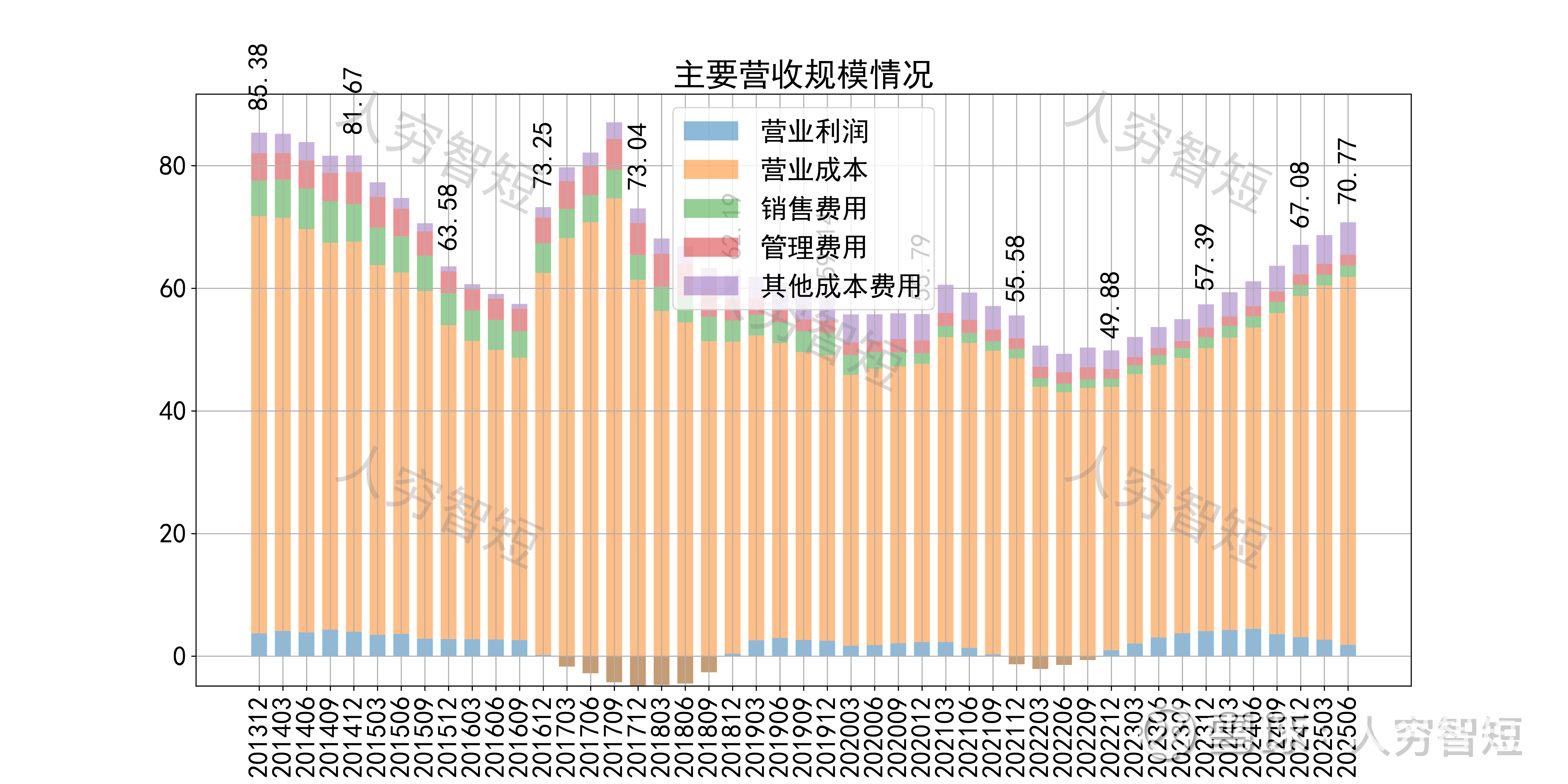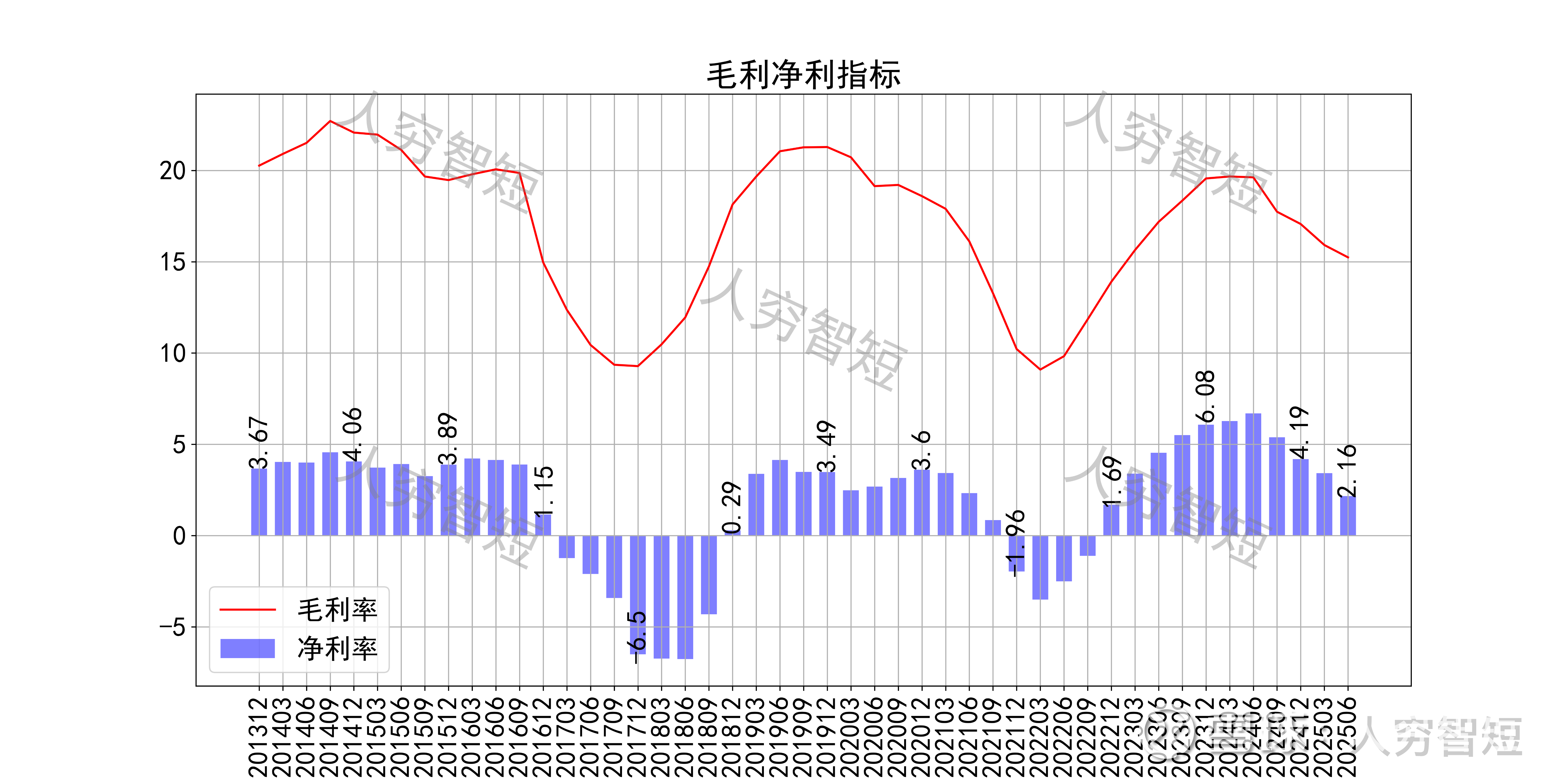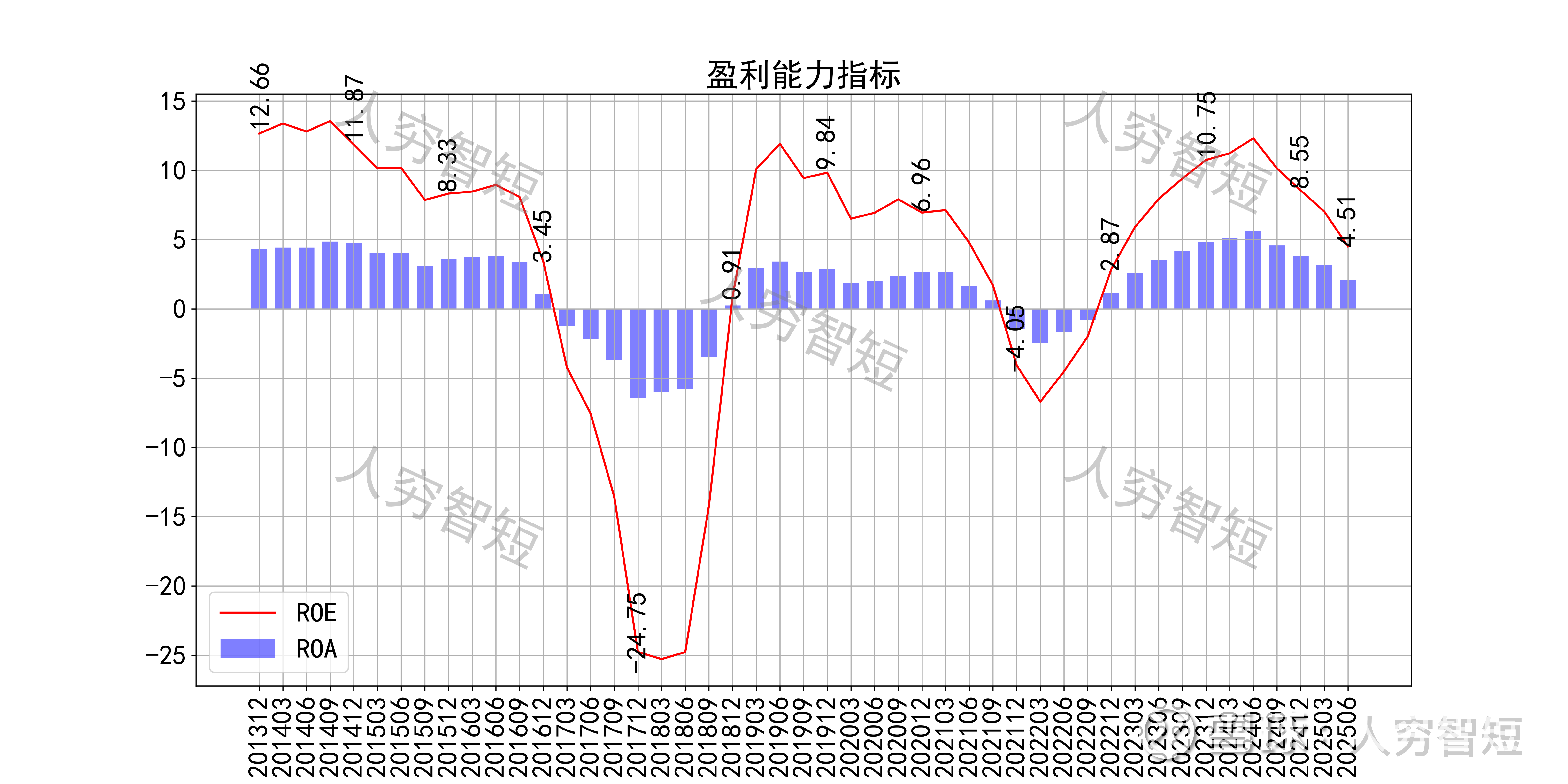 最近十年营收规模复合增长率约为-1.59%,到25年6月末,TTM营业收入为70.77亿元。成本费用端构成来看,营业成本占据主要地位,成本构成中原材料占比约74%,人工及能源支出占比各约7%。整体毛利率周期性波动,近年来周期性有所减弱,或与原材料采购中大量使用期货及远期合约锁定成本有关,近年来净高位下滑,尚未到底部区域。各项费用控制一般,管理费用、销售费用占比持续走低,但研发费用抬升带动整体成本费用占比下滑较慢。盈利指标ROE、ROA显示,盈利能力自高位持续下滑,最新ROE在4.51%左右。