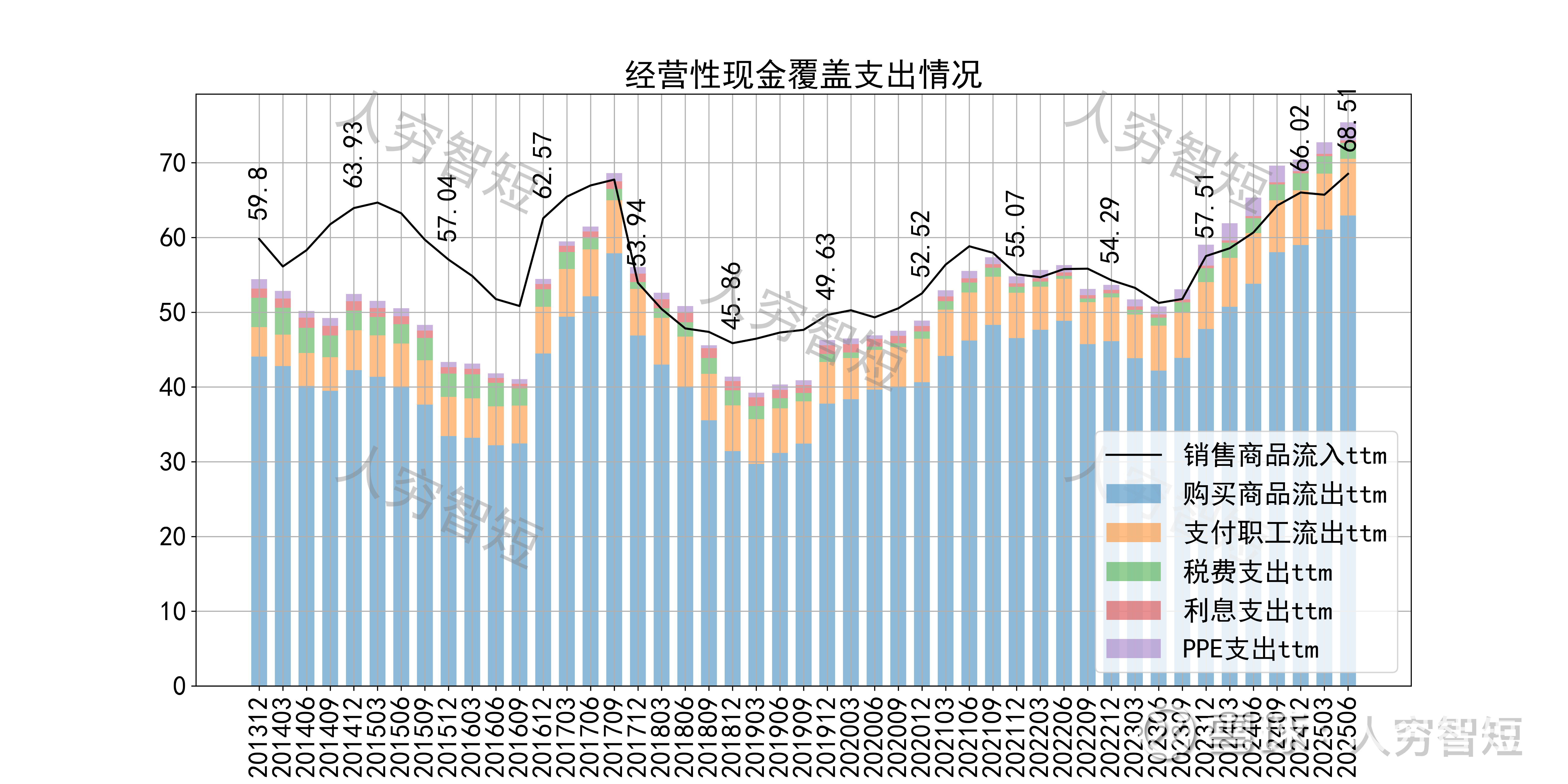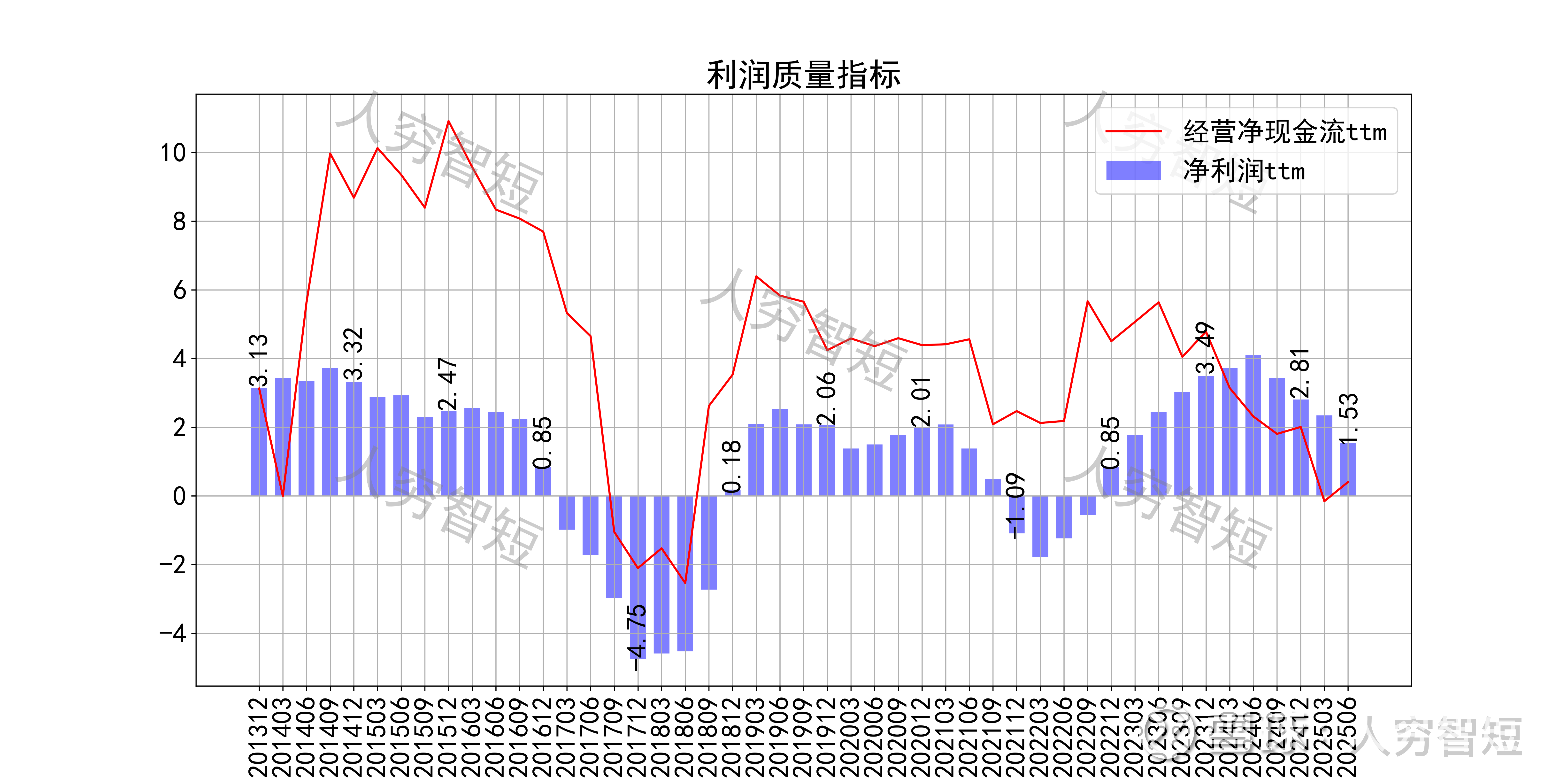 收入、利润的现金含量来看,近年来销售商品流入的现金流基本覆盖营业收入;经营现金流波动较大,平均净额高于净利润,主要差异源于各项资产折旧摊销(年约3亿元)、以及应收项目的增加等。