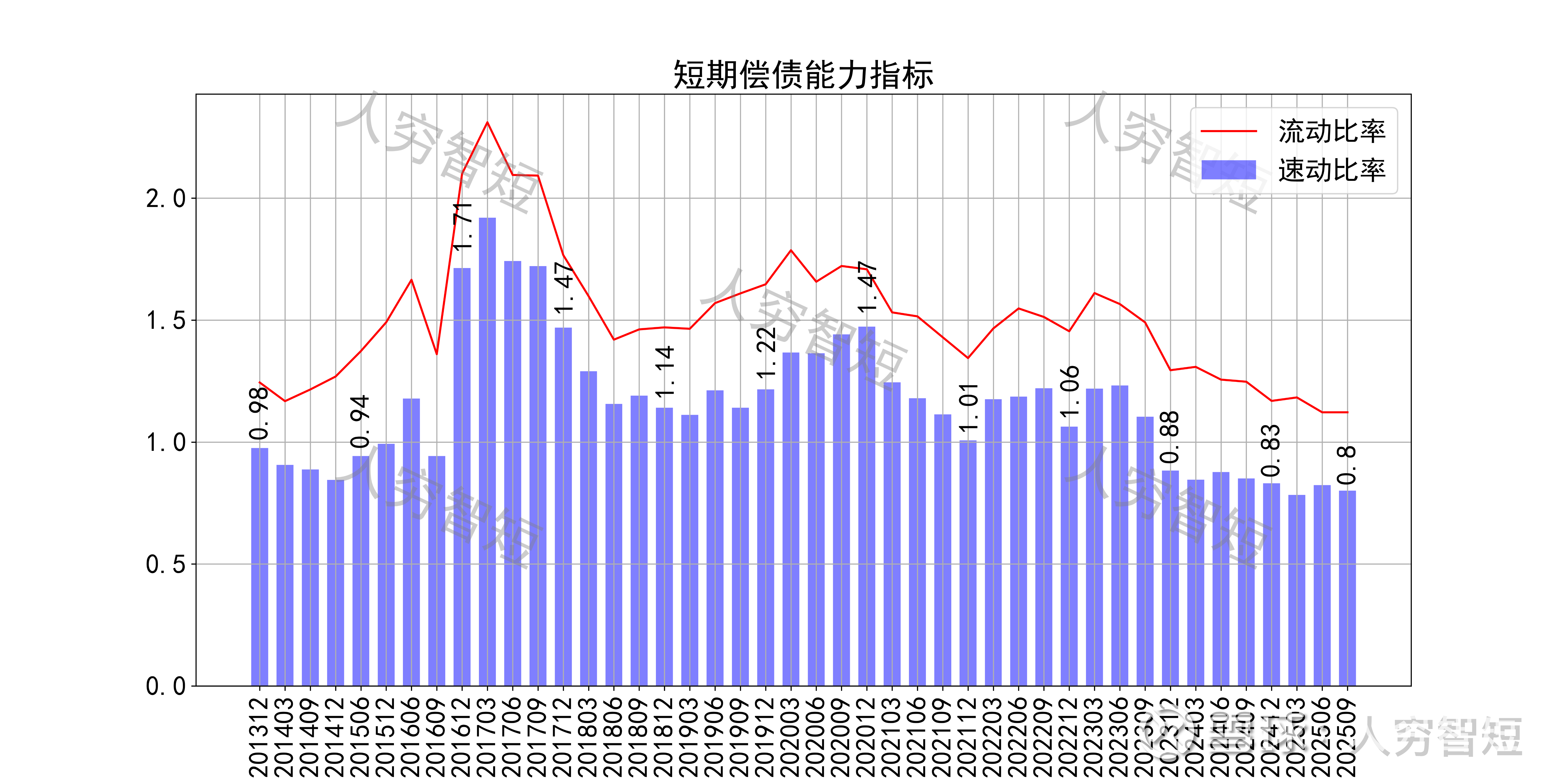 长期偿债指标中,资产负债率震荡走高,近年增加至53%左右,有息负债率约为36.3%,债务负担较重,对供应链上、下游资金占用偏弱。短期偿债指标中,流动比率、速动比率波动下滑,二者有一定差异,主要系存在一定规模存货所致,资产短期流动性一般。