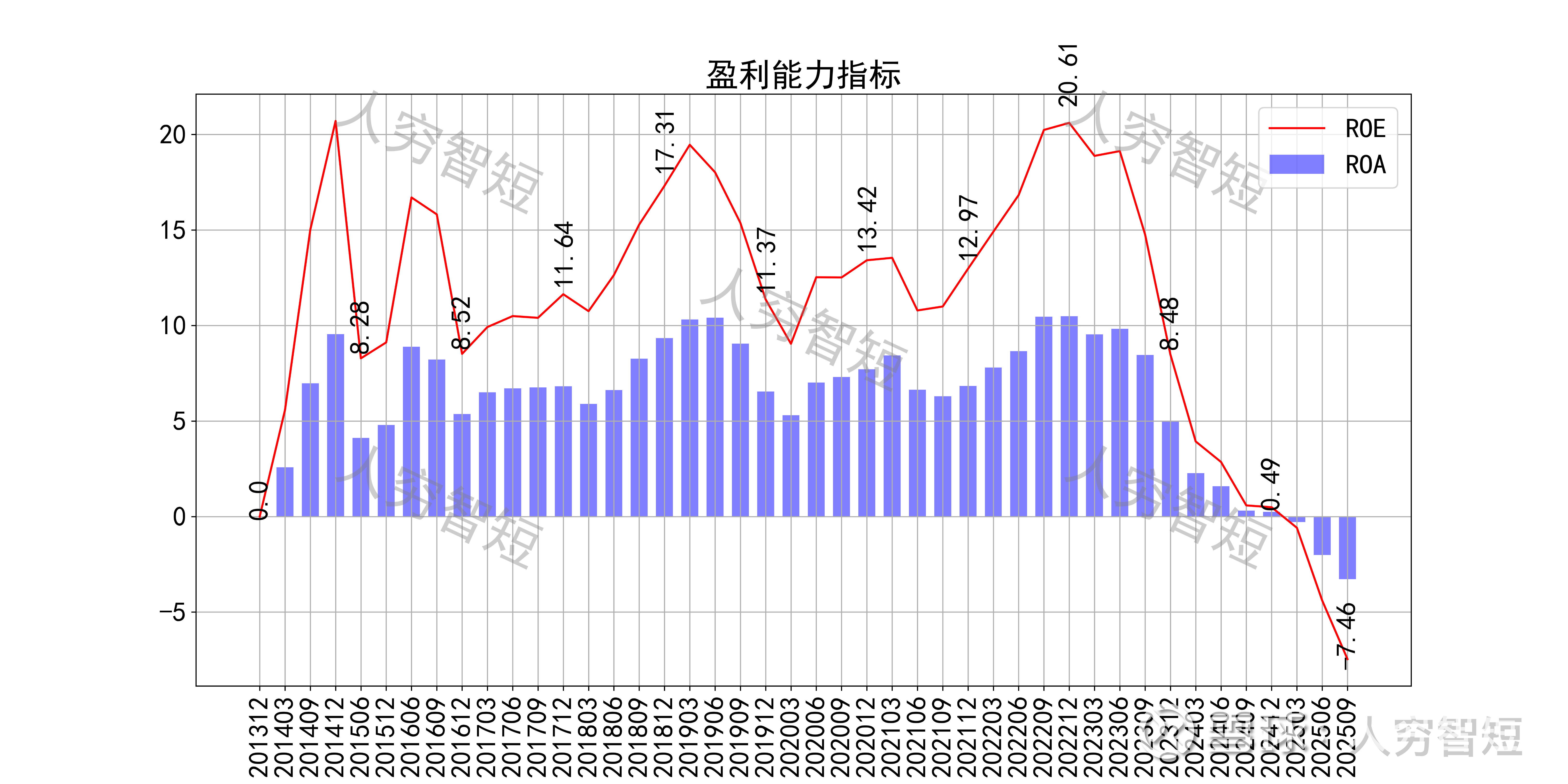 最近十年营收规模复合增长率约为12.12%,到25年9月末,TTM营业收入为25.15亿元,总体有所企稳。成本费用端构成来看,营业成本占据主要地位,成本构成中原材料占比约63%,折旧占比约11%,其余人工、能源等费用占比各约6%、7%。整体毛利率大幅下滑,近年来高位下滑至10%左右,净利率同步波动,持续走低并出现亏损。各项费用控制较差,销售费用、管理费用占比缓慢走高,带动整体成本费用占比维持高位。盈利指标ROE、ROA显示,盈利能力自高位持续下滑,最新ROE在-7.46%左右。