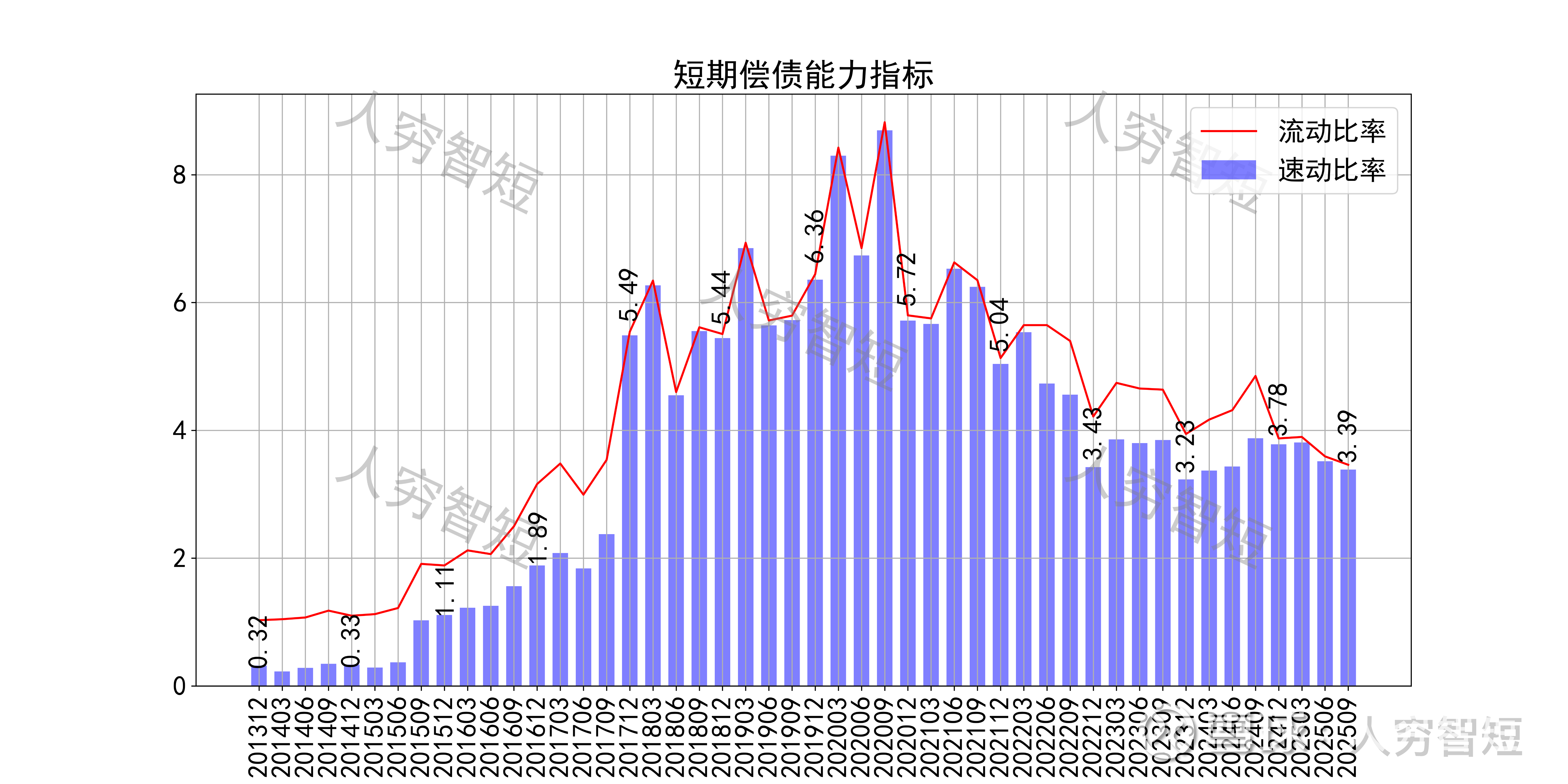 长期偿债指标中,资产负债率高位下滑,近年约为15%左右,有息负债率约为4.08%,几乎无债务负担,对供应链上、下游资金占用较弱。短期偿债指标中,流动比率、速动比率高位下滑但仍较为可观,二者几乎无差异,主要系存货规模较小所致,资产短期流动性强。