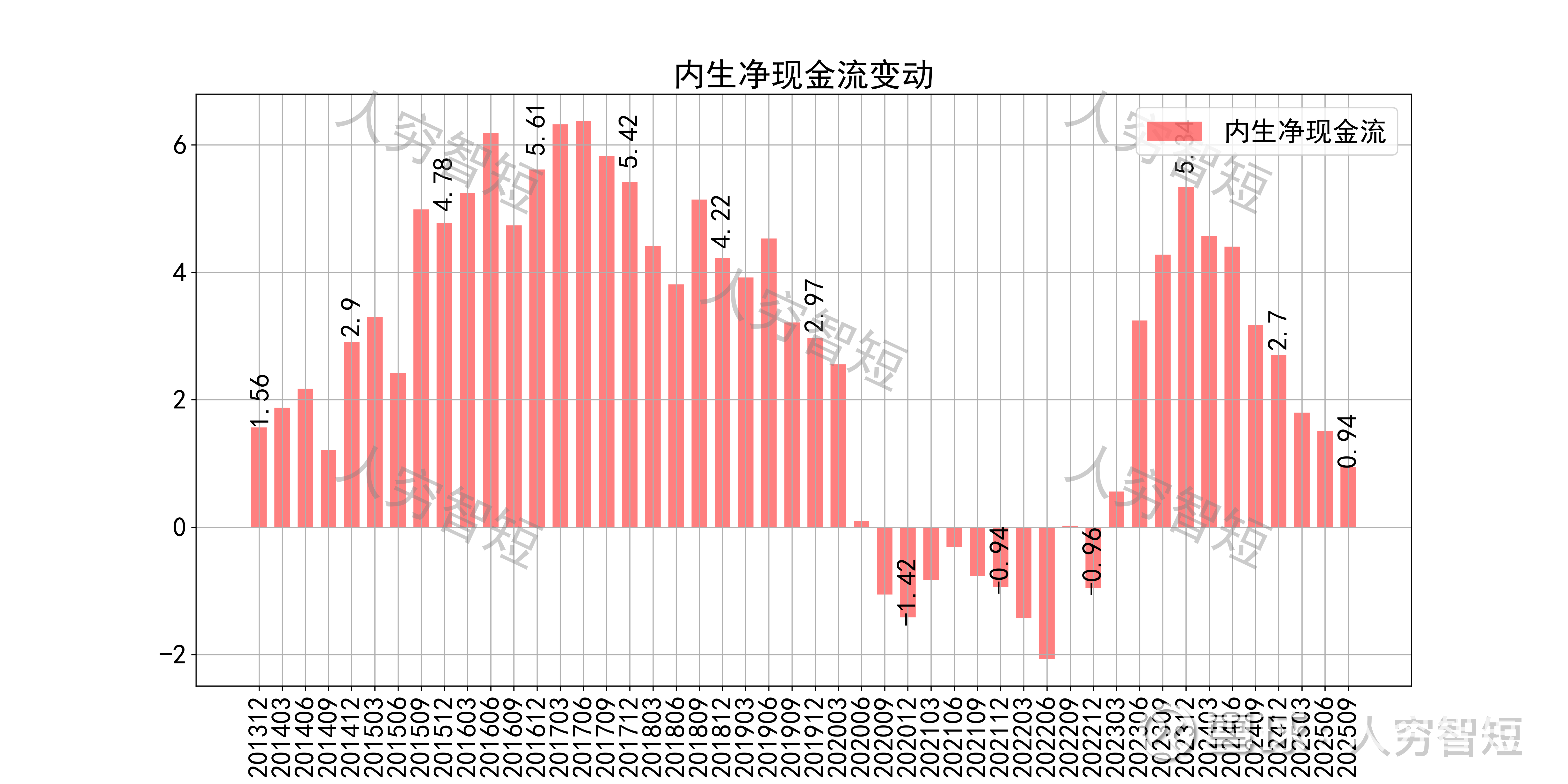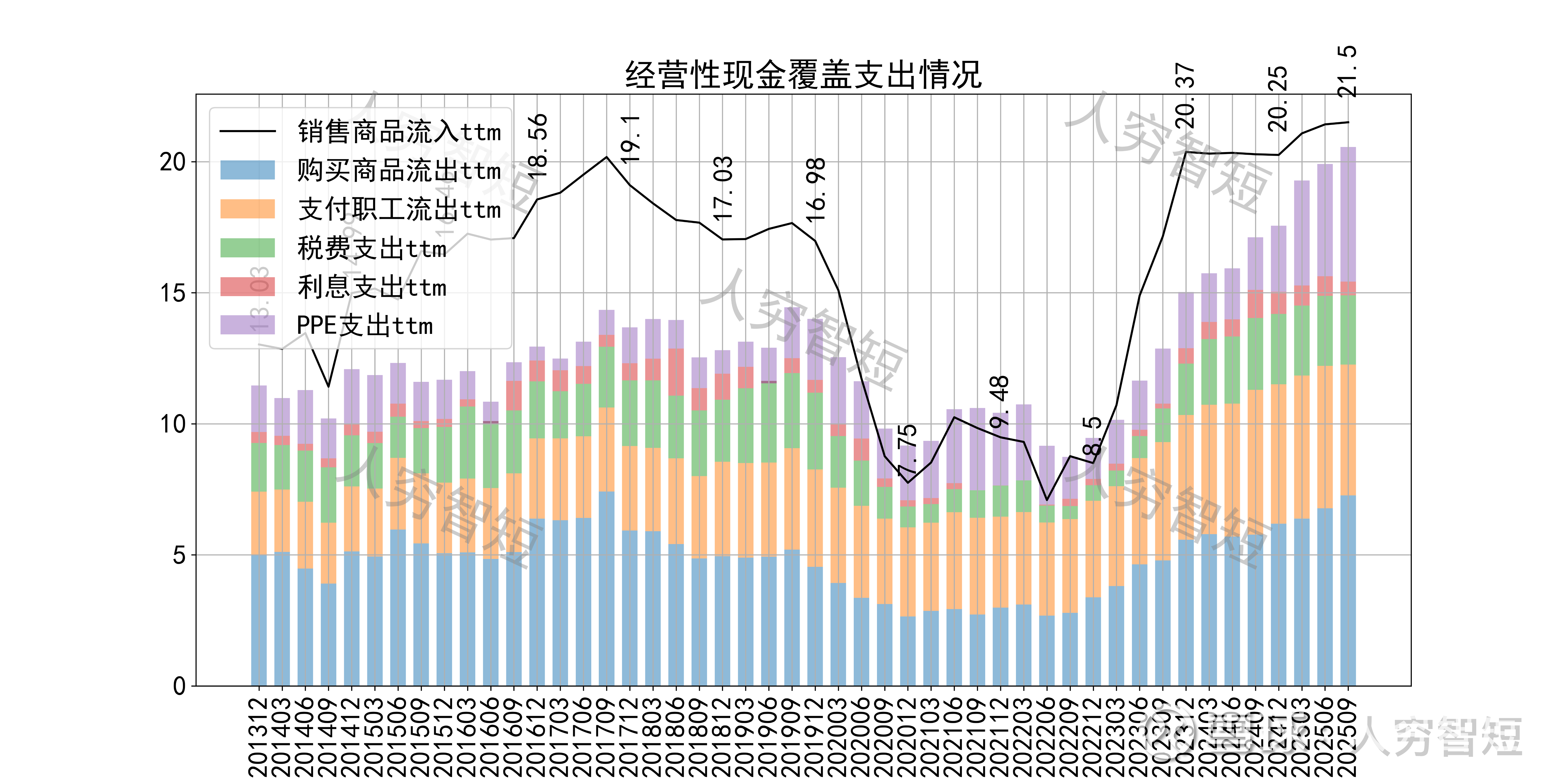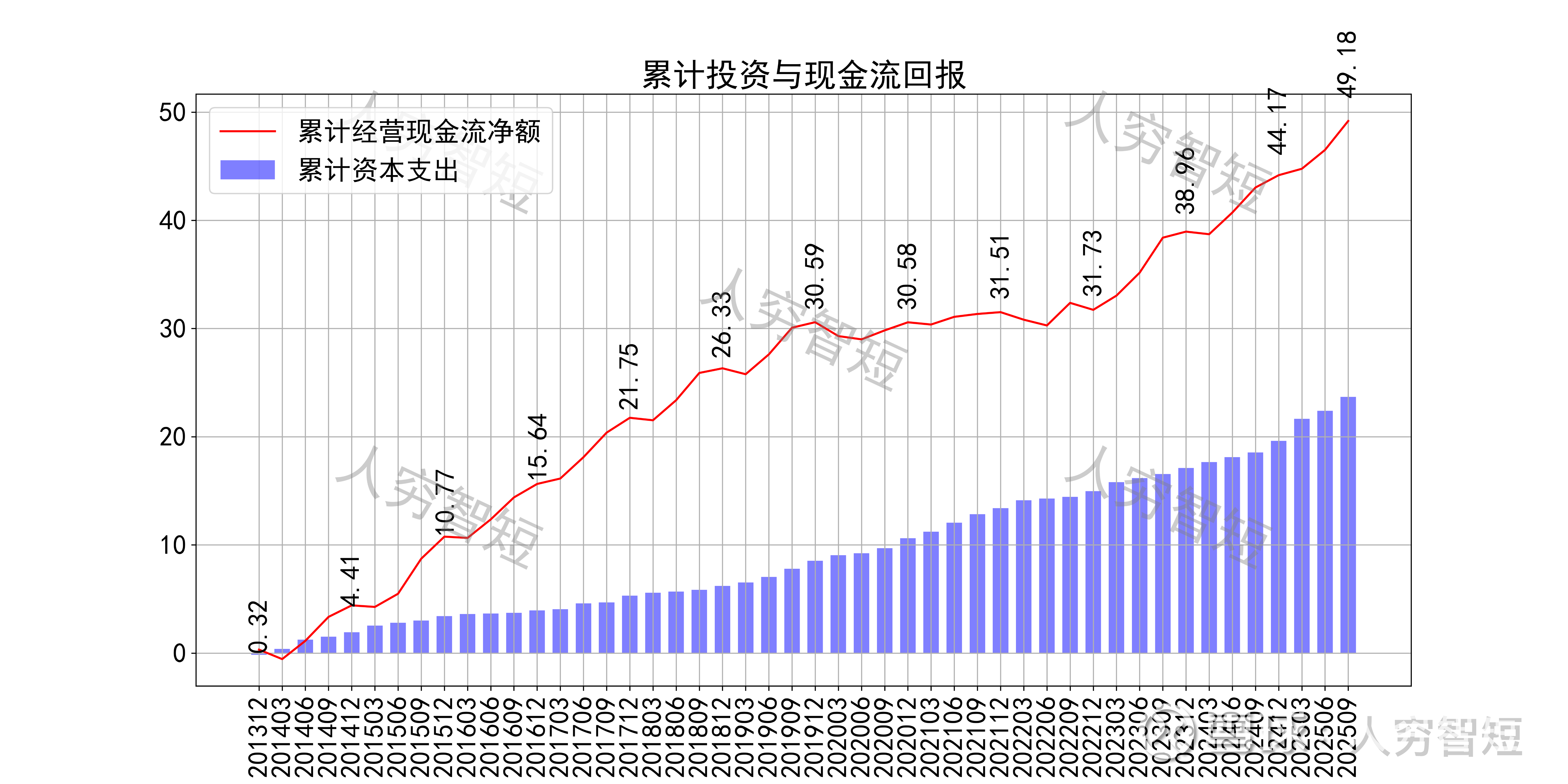 现金流收支方面,近几年销售品获得的现金流足以满足日常的成本、费用以及扩大再生产,结余较好,随着近年来资本支出大幅增长,现金流结余持续下滑,目前为历史偏低水平;长期现金流回报高于资本支出水平。